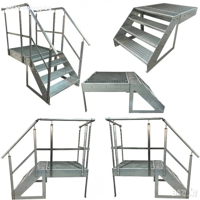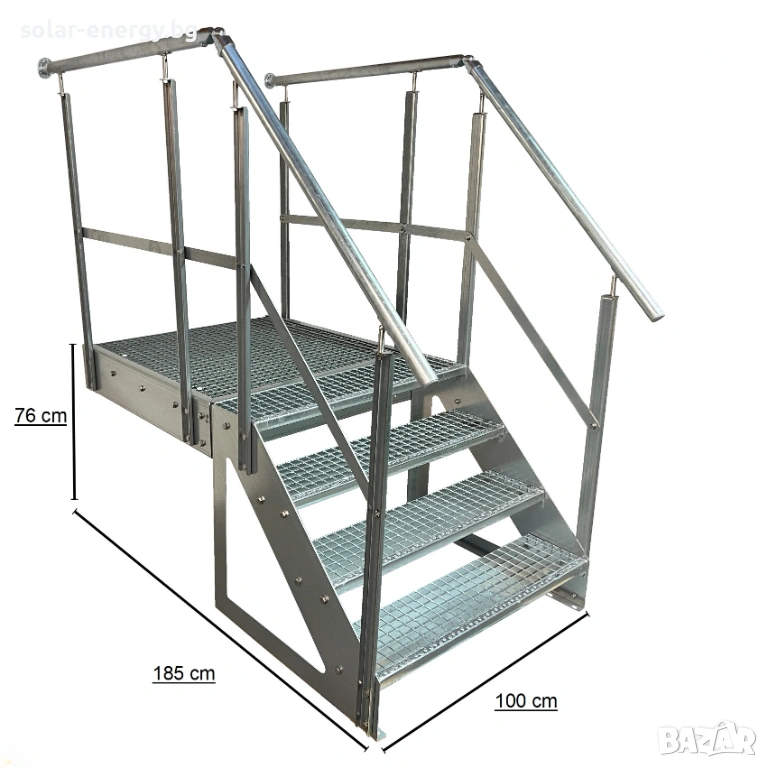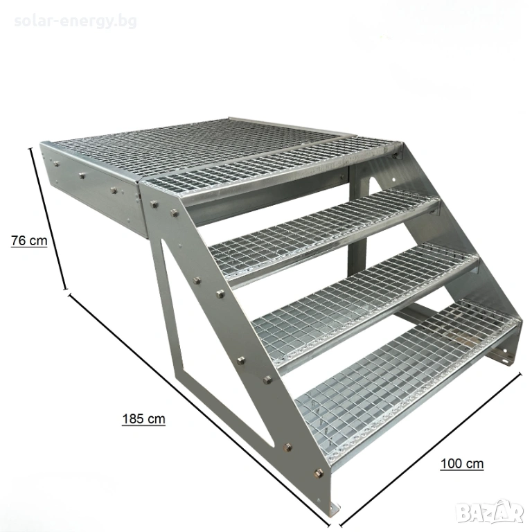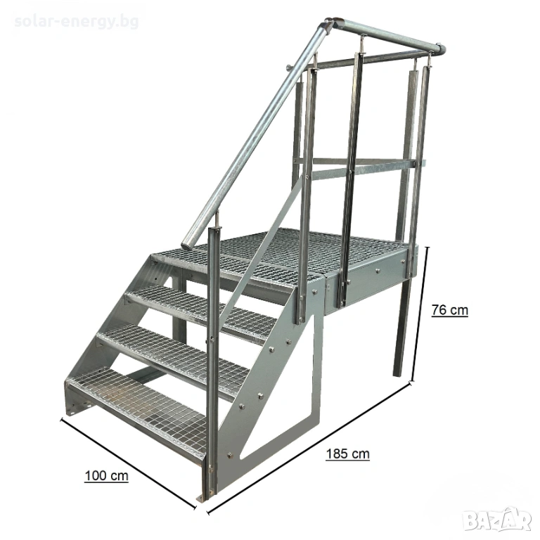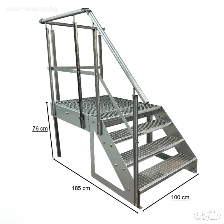 Предлагаме висококачествено метално стълбище с площадка и 4 стъпала, подходящо за външни и индустриални приложения.