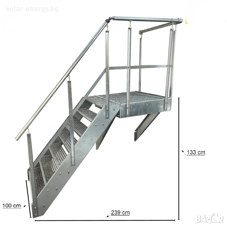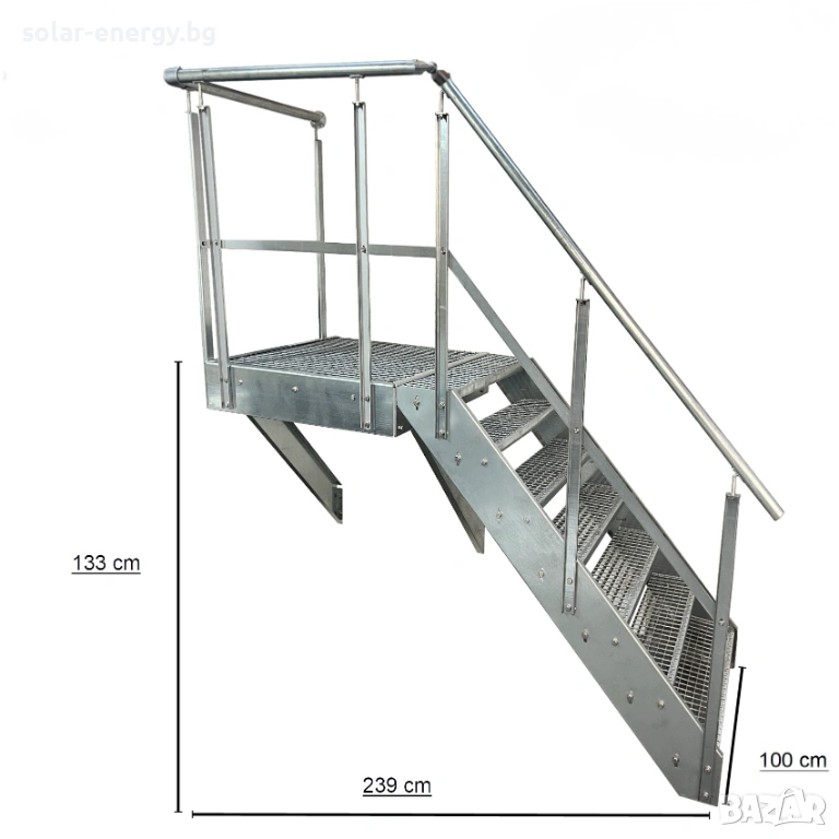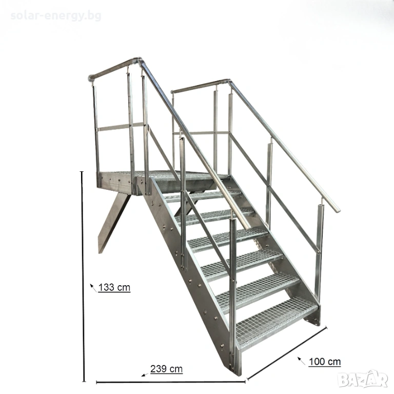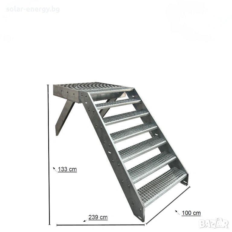 Предлагаме висококачествено метално стълбище с площадка и 7 стъпала, подходящо за външни и индустриални приложения.