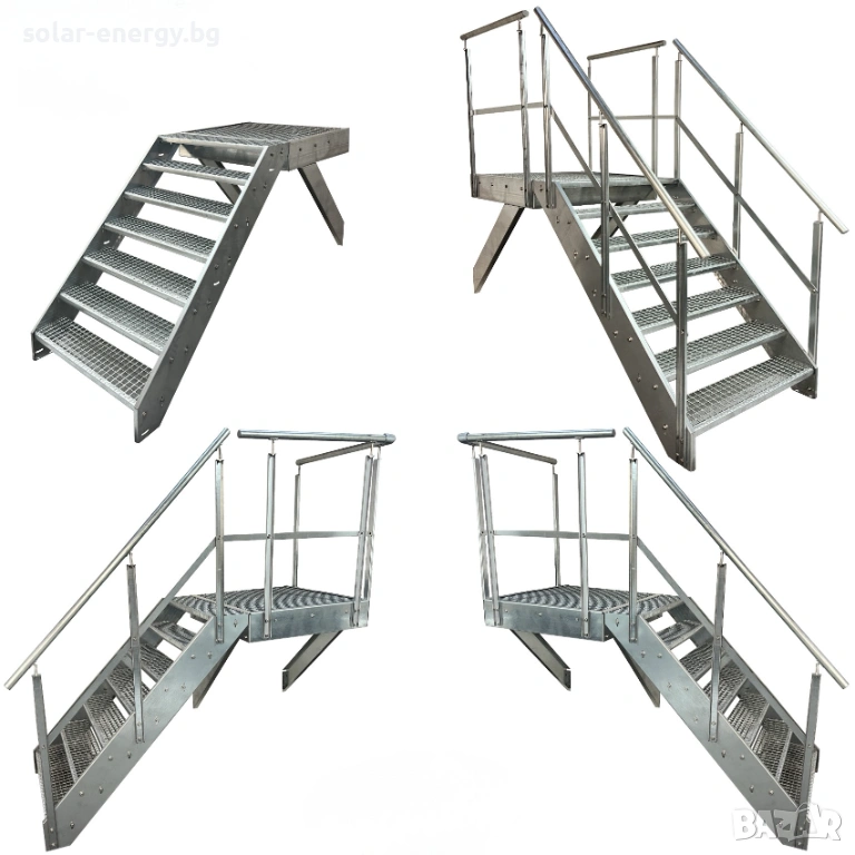 Стълбището е изработено от стомана с горещо поцинковане съгласно DIN EN ISO 1461, което осигурява дълготрайна защита от корозия и атмосферни влияния.