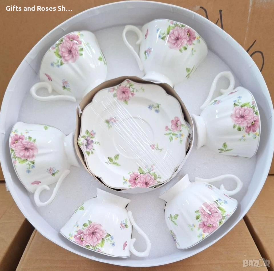 Прекрасен порцеланов сервиз за капучино или чай - включва 6 чаши 200 мл и 6 чинийки в нежен декор от розови цветя.