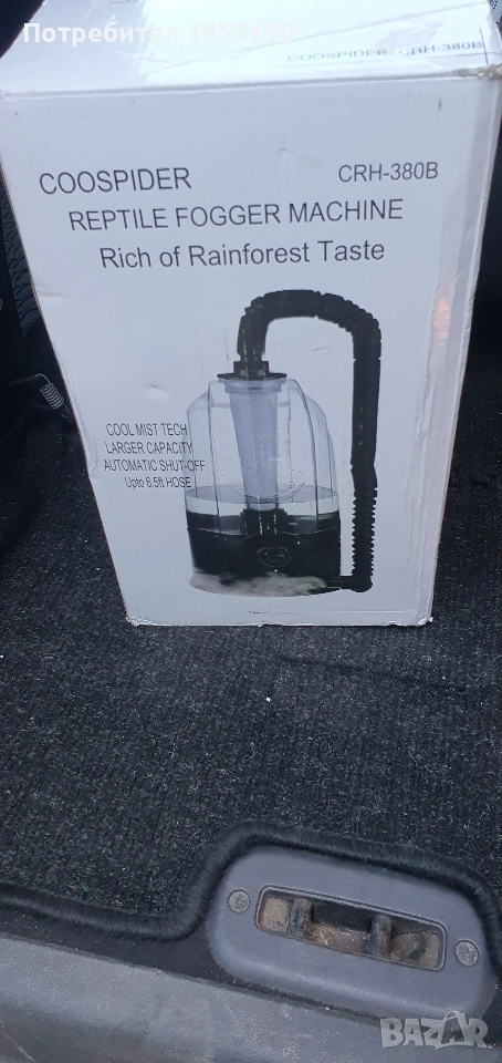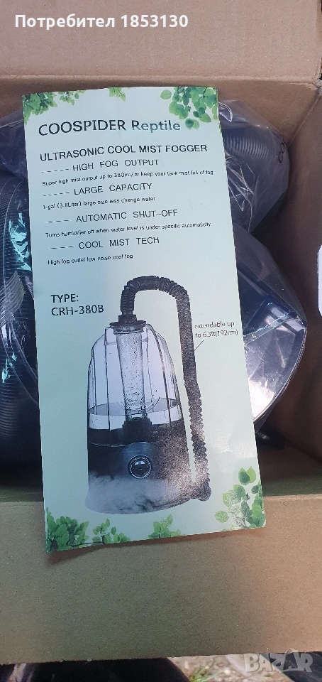 овлажнител за терариум Coospider CRH-380B, предназначен за влечуги. Капацитет на резервоара: 3 литра. Дължина на маркуча: До 1.98 метра (6.5 фута). Характеристики: Регулируем изход за мъгла, автоматично изключване при липса на вода (Dry Run Protection). Технология: Ултразвукова технология за студена мъгла.