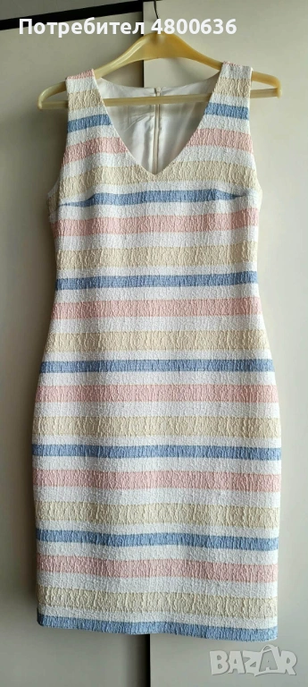 Материята не е разтеглива и затова мерките ви трябва да отговарят на тези на роклята, за да ви пасне идеално и да оформи един много красив дамски амфорен силует, подсилван от съвсем лекото стесняване на роклята в долният край. Закопчаването е отзад със фин и нежен скрип цип. С една дума, това си е направо френски шик., особено ако се съчетае с подходящите аксесоари.
