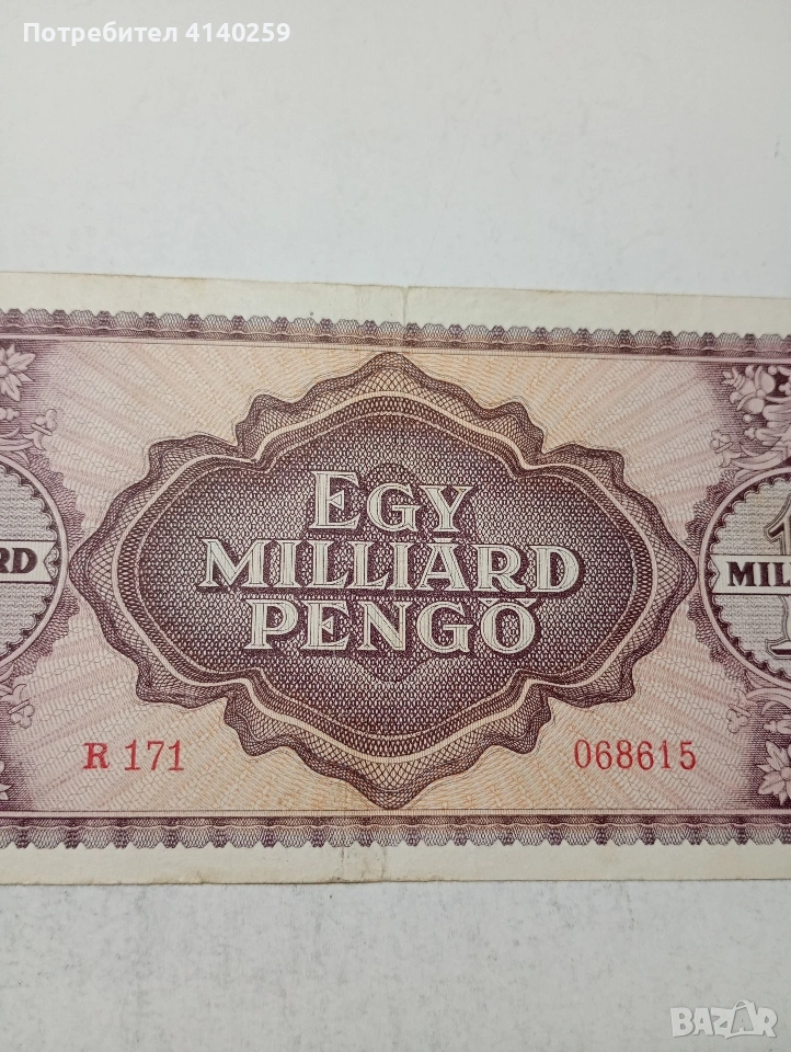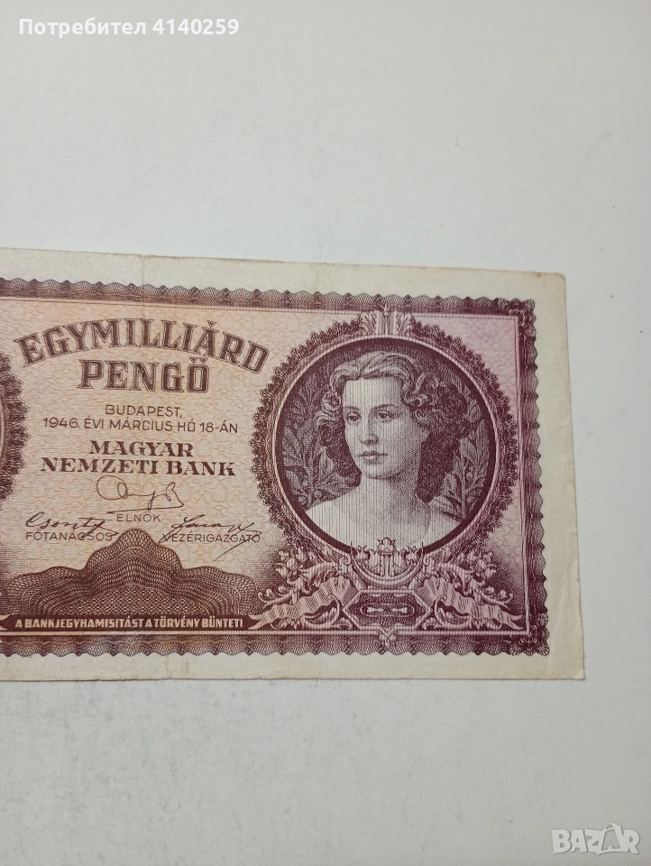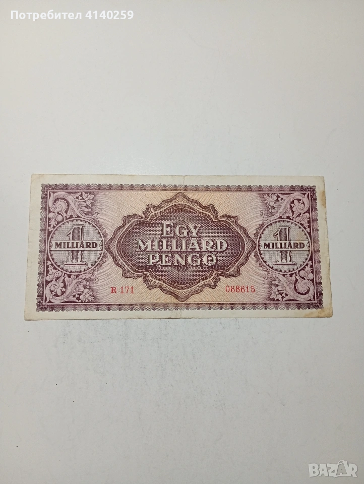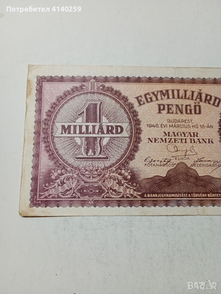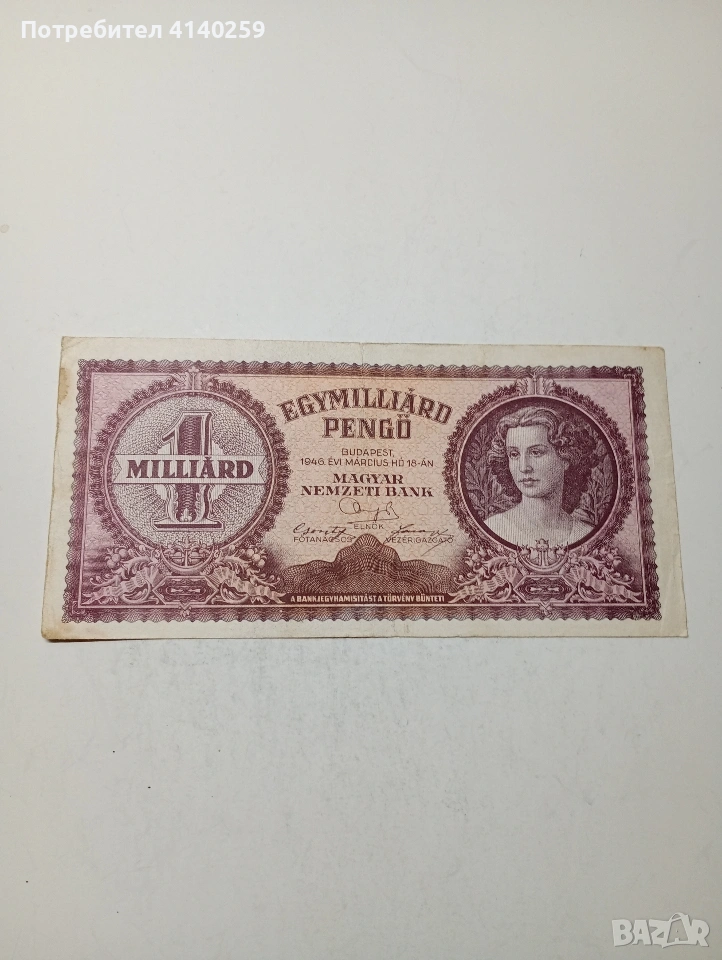 УНГАРИЯ БАНКНОТА 1 МИЛЯРД ПЕНГЬО 1946 Г СЪСТОЯНИЕ ВИДИМО ПОЛУЧАВАТЕ СНИМАНАТА БАНКНОТА РАЗГЛЕДАЙТЕ ДРУГИТЕ МИ ОБЯВИ ДА КОМБИНИРАТЕ ДОСТАВКА ЕКОНТ ЗА ВАРНА ЛИЧНО