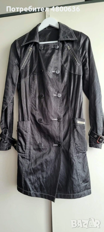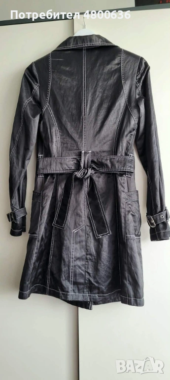 Манто (тренчкот) от черен мек гланциран плат, гарниран с бели декоративни шевове. Подплатено е със чудесно кореспондираща черно-бяла подплата. Закопчаване е двуредно, като се разкопчаят горните копчета се получава красив двоен ревер. Разполага с колан, който може да се върже отзад или отпред, въпрос на предпочитание. Има два средно големи външни джоба, декорирани с цип отпред. На единия джоб е логото на Модна Къща JUNONA, защото мантото е от колекцията на тази модна къща. Дължината на мантото (тренчкота) е 90 см.