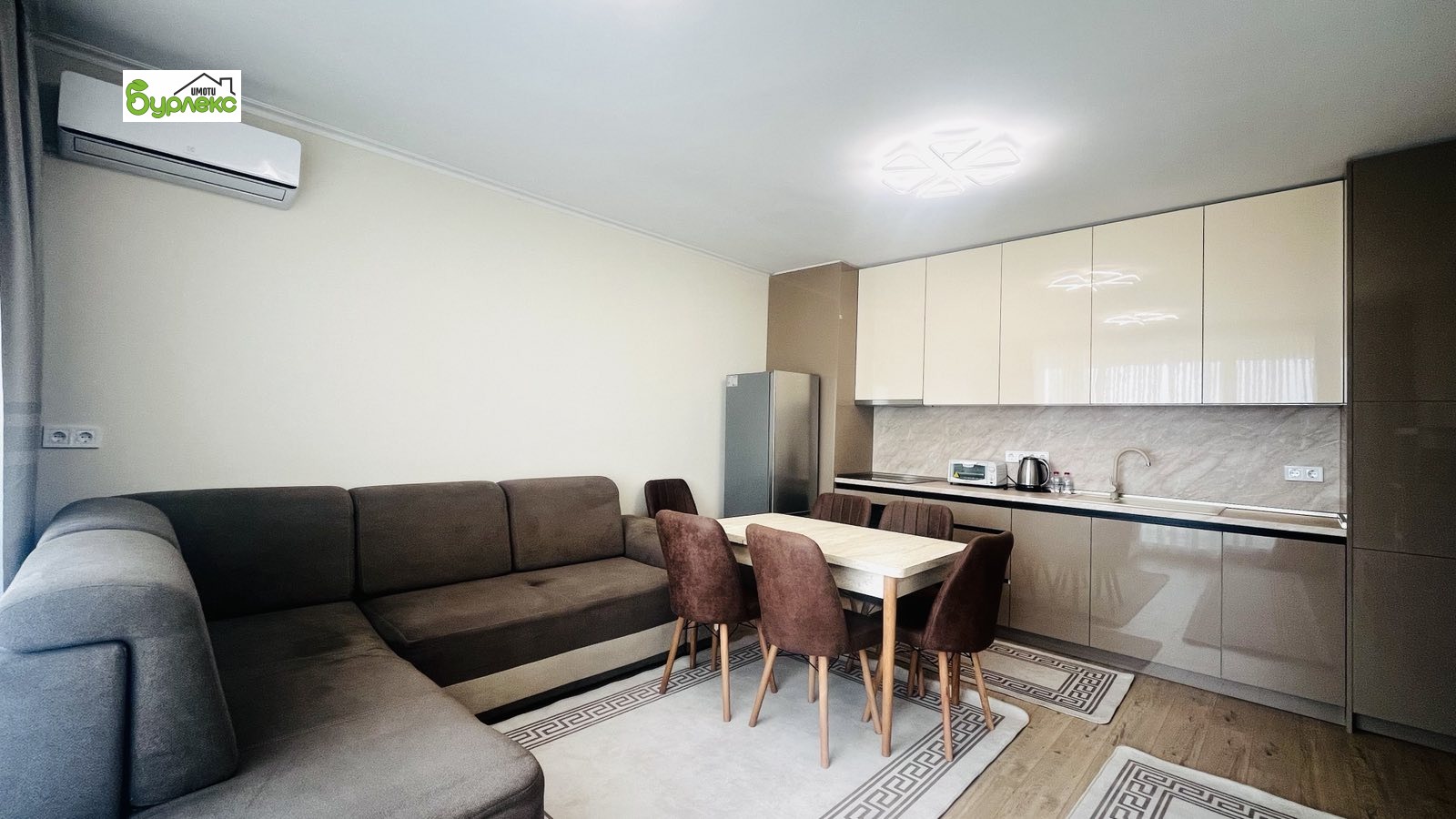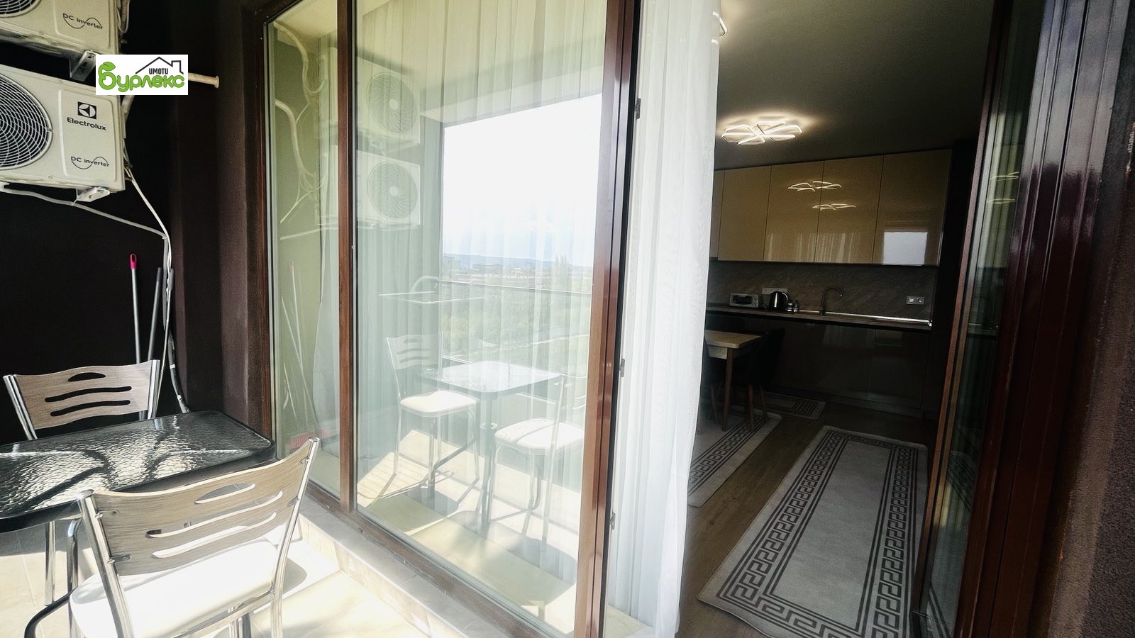 Апартаментът се намира на 7 етаж с южно изложение. Има следното разпределение: дневна с кухненски бокс, спалня, баня с тоалетна, тераса. Всички помещения са много светли, обзаведени със стилни мебели и висок клас електроуреди (съдомиялна, пералня, фурна, котлони, аспиратор, хладилник, прахосмукачка).