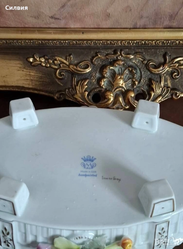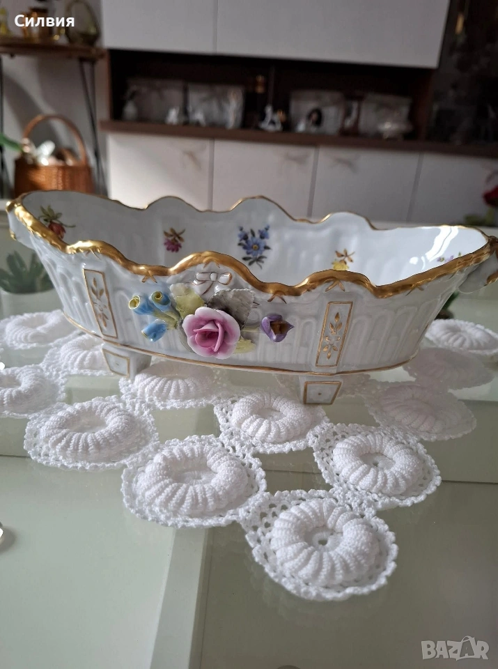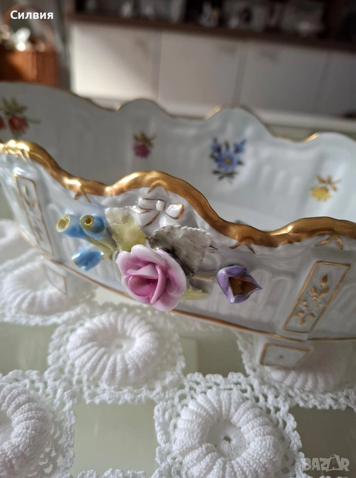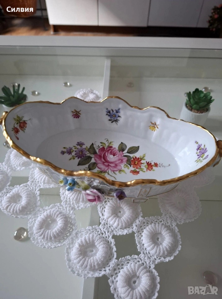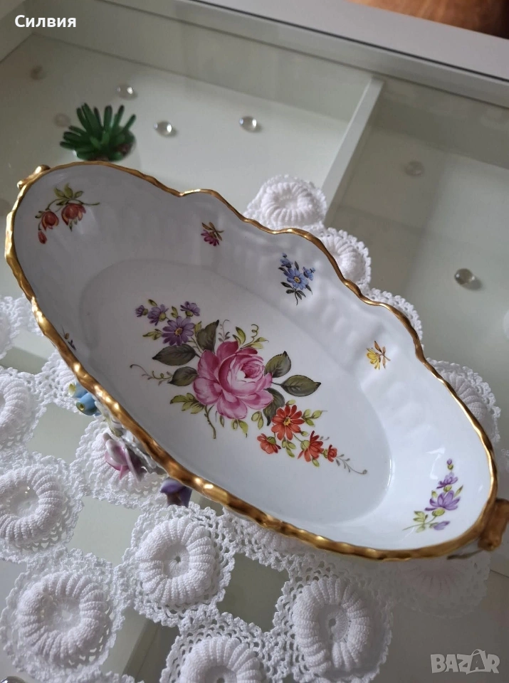 Елегантност и Романтика Schierholz Plaue GDR ೋ🌷 ೋ🌷 ೋ🌷 Винтидж Порцеланова Фруктиера/Декоративна Купа/ Панер за хляб с Ръчно Рисувани Рози и Златен Кант. Изящно порцеланово съкровище. Тази очарователна фруктиера (или декоративна купа), изработена от фина порцеланова мануфактура и обозначена с марката "Made in GDR, handpainted", носи в себе си духа на отминала, романтична епоха.с детайли, които вдъхновяват. Изящен Дизайн Формата е елегантно продълговата, стъпваща на четири малки крачета, които ѝ придават лекота и изисканост. Страните са украсени с вертикални релефни орнаменти. Ръчно Рисуван Букет: Сърцето на декорацията е букет от класически рози в нежни розови и червени тонове, обградени от диви цветя в лилаво, оранжево и синьо. Всяко цветно петно е положено с майсторство, което превръща предмета в произведение на изкуството. Обемни Порцеланови Цветя: Страничните стени са богато украсени с триизмерни порцеланови цветя и листа – фино моделирани детайли, които излизат от порцелана и добавят дълбочина и неповторим чар. Лъчист Златен Кант: Вълнообразният ръб на купата е подчертан от пищен златен кант, който отразява светлината и подчертава празничното ѝ излъчване. Златистата украса продължава и по дръжките и крачетата. Идеална за Вашия Дом: Тази купа е перфектна за сервиране на плодове, десерт като център на масата или просто като самостоятелен декоративен елемент, който ще внесе топлина, история и аристократичен шик във всеки интериор. Размери:Дължина (от край до край): Приблизително 26 см. Ширина: Приблизително 12-14 см. Височина: Приблизително 8,5 см. Оригинална, Ръчно рисувана продукция на историческата фабрика "Schierholz Plaue" от периода на ГДР. Предметът е в запазено винтидж състояние, което свидетелства за грижовно отношение през годините. Малките следи от времето само допринасят за неговата автентичност и история. Добавете магията на винтидж порцелана към Вашата колекция! Марката Von Schierholz Porzellan Manufaktur Plaue е една от най-значимите в германската порцеланова традиция, известна с високото си качество, богато украсени фигури и, разбира се, предметите с обемни цветя. Мануфактурата е основана през 1816 г. в град Плауе (Plaue), Тюрингия. След Втората световна война: Тъй като Тюрингия попада в Източна Германия (Германската демократична република, ГДР), компанията е национализирана. Значението на Марката "Schierholz Plaue" Ръчна Изработка: Фабриката е известна с високия си стандарт на качество и запазването на традиционните методи, като ръчното рисуване и апликацията на обемни порцеланови цветя (наречени "encrusted flowers"), което прави този екземпляр особено желан. Колекционерска Стойност: Порцеланът от Schierholz Plaue е високо ценен сред колекционерите по целия свят, особено този, който е богато декориран с цветя и златен кант. Специализация: Те стават световно известни и с производството на литофани – много фин, неглазиран порцелан с гравирани изображения, които се виждат само на прозирна светлина. Маркировката на Дъното Логото с Короната: Макар да има вариации през годините, логото с корона над инициали (понякога PMP – Porzellan Manufaktur Plaue) е основният идентификатор на фабриката. "Handpainted": потвърждава, че букетът рози и златният кант не са декор, нанесен с печат, а са ръчно изрисувани, което повишава стойността на предмета. Цена1️⃣8️⃣0️⃣€ 352лв
