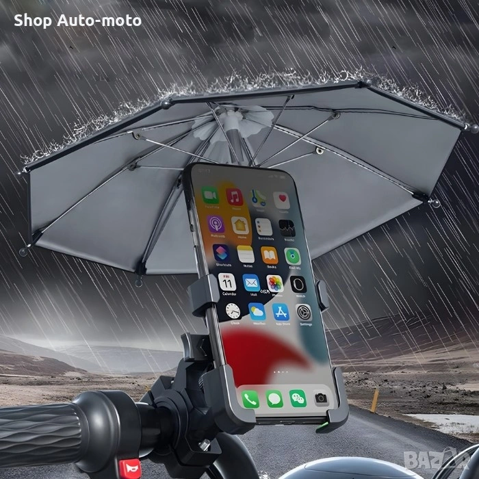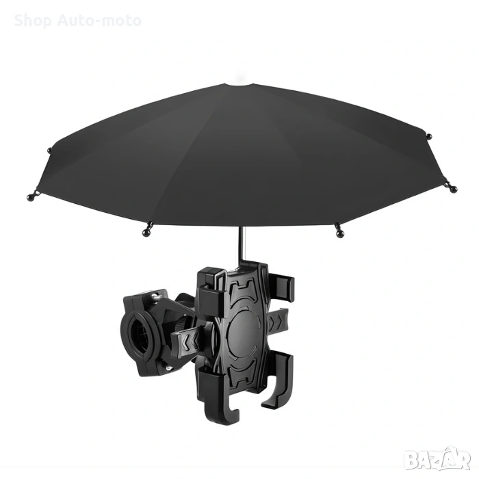 Този модел съчетава стабилно захващане и защита от атмосферни условия, като осигурява сигурно позициониране на вашия смартфон дори при неравни терени. Вграденото чадърче предпазва устройството от дъжд, силно слънце и отблясъци, което го прави изключително подходящо за всякакви условия.