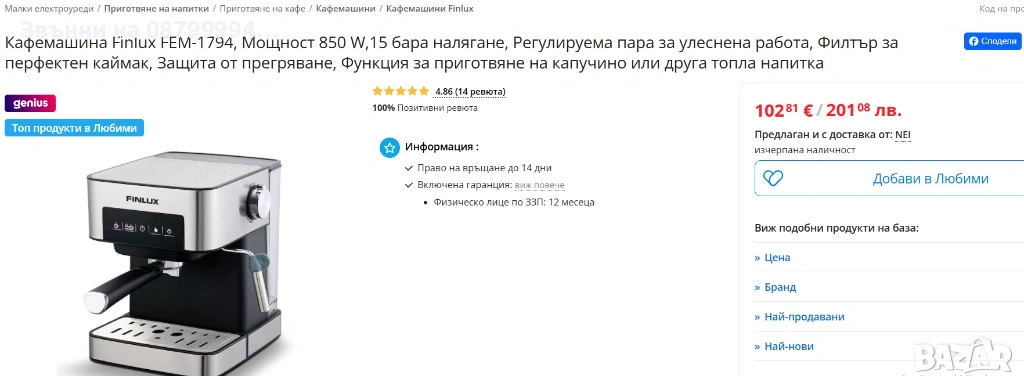 Кафемашина FINLUX FEM-1794, Мощност 850 W,15 бара налягане → Обява 54237627