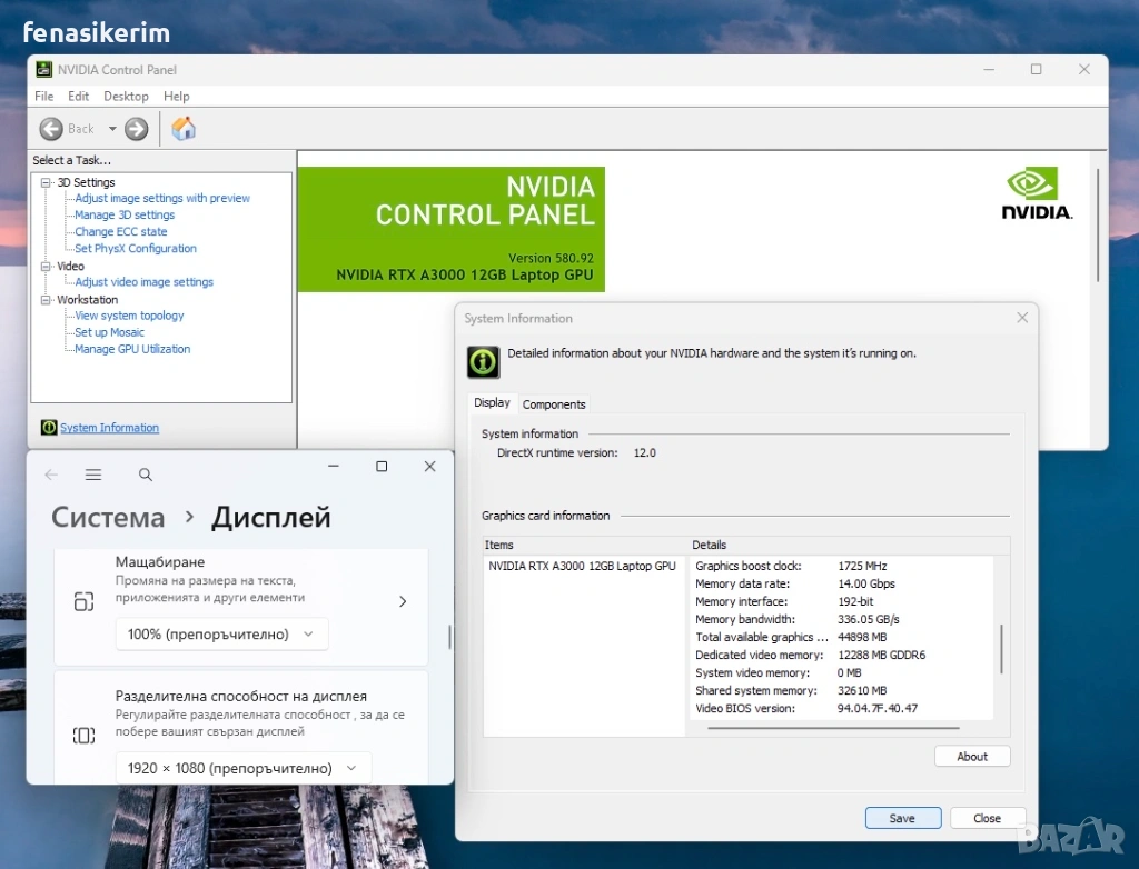 2 видеокарти : Nvidia RTX А3000 192bit 12GB DDR6 собствена памет + Intel UHD Video - up to 78 GB Total Graphics memory.