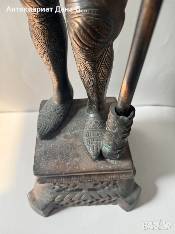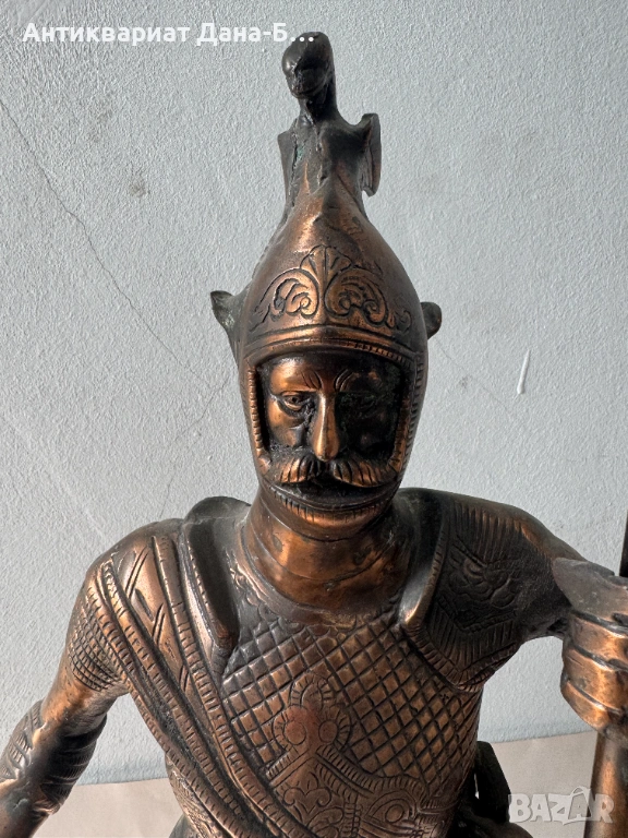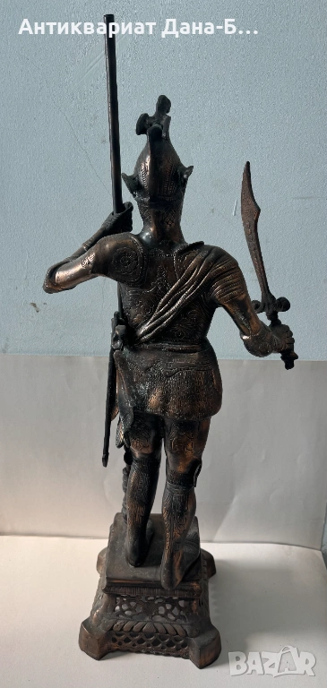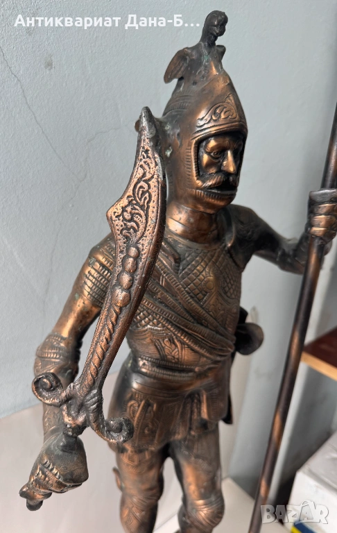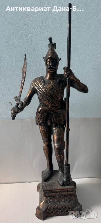 Състояние: Много добро антикварно състояние. Патината е естествена и равномерна, подчертаваща релефа на бронята. Всички елементи (меч и копие) са налични.