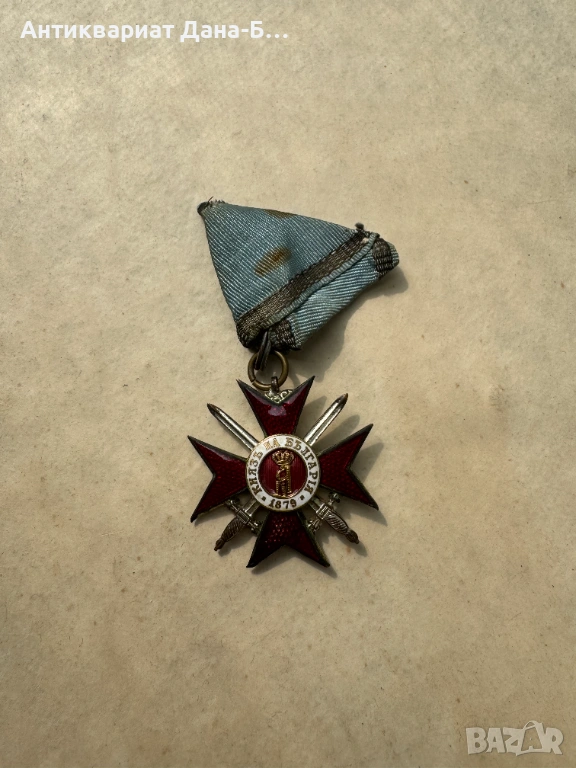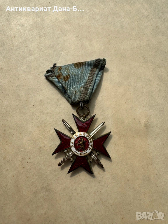 Състояние: Много добро антикварно състояние. Червеният емайл върху раменете на кръста е отлично запазен. Лентата (триъгълна форма) носи следи от времето, които потвърждават нейния автентичен произход.