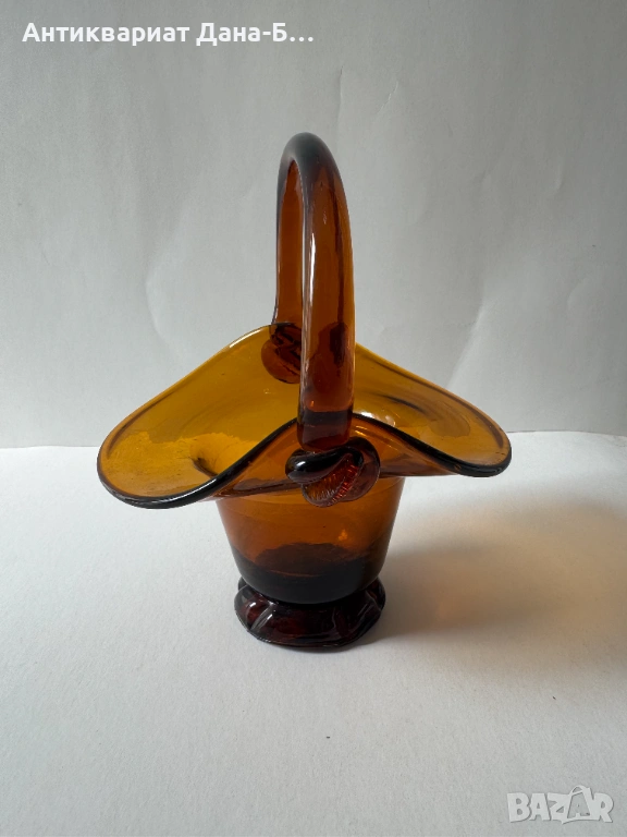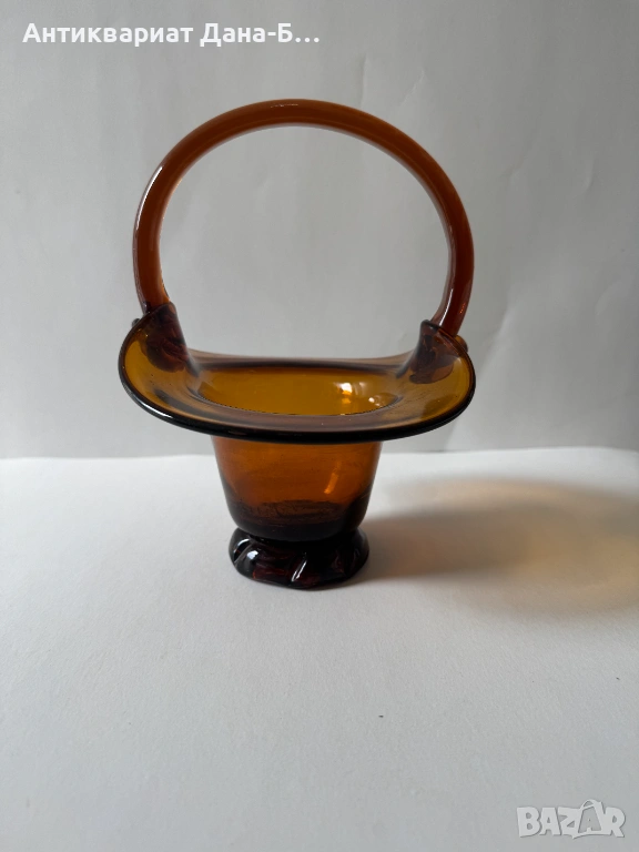 №20 Изящна декоративна кошница, изработена от масивно цветно стъкло в топъл кехлибарен (амбър) нюанс. Предметът е типичен образец за художественото стъкларство от средата на XX век, съчетаващ елегантност и ретро чар. Кошничката е ръчна изработка, което личи по плавните извивки на дръжката и специфичното захващане към тялото.