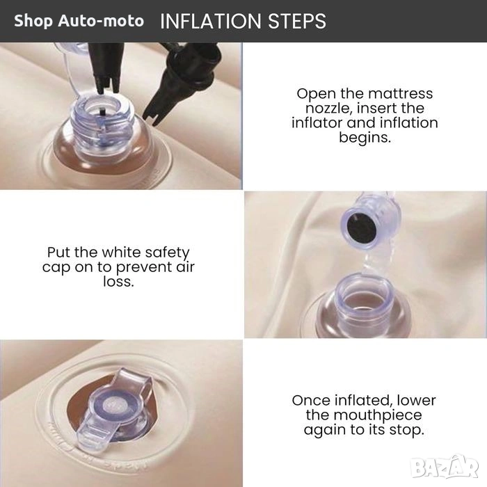 Бързо и лесно. Просто трябва да свържете въздушната помпа към запалката на колата и след 2-3 минути матракът ще бъде надут. Освен това матракът има дизайн с два клапана, който ефективно предотвратява изтичане на въздух