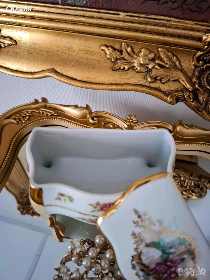 Тялото на „скрина“ е украсено с ръчно декорирани флорални елементи. Нежните розови цветове и фините листенца са разпръснати с вкус, подчертавайки белотата на порцелана.