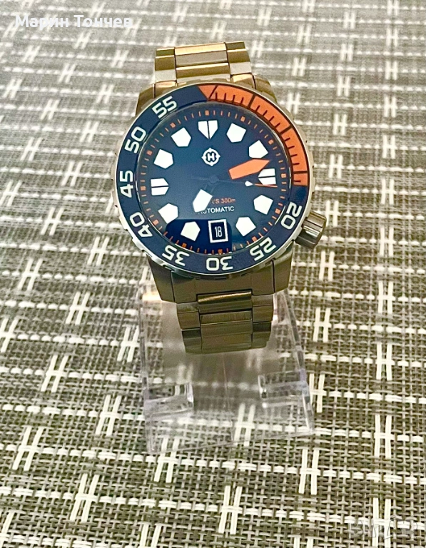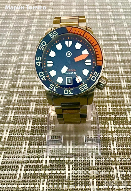 С оригиналната верига в пълен размер с три допълнителни звена (разпробени лъгове за по-лесна смяна) + оригинална оранжева NATO каишка – отлична комбинация за лятото.