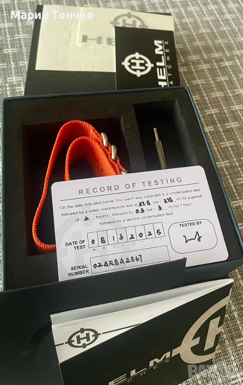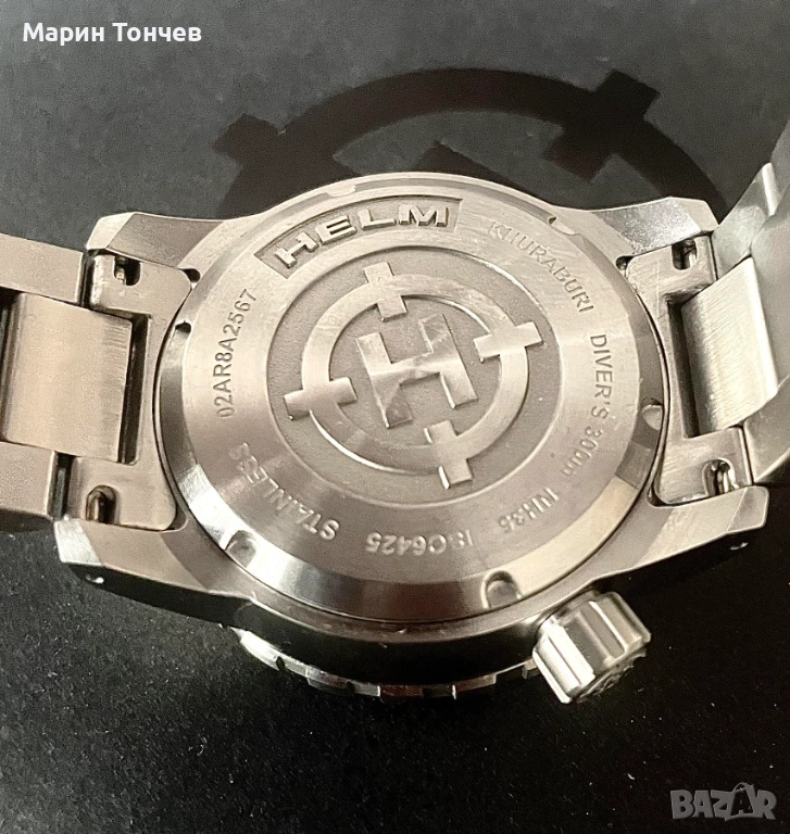 Отличен часовник тип Diver – HELM Khuraburi 02AR8. Корпусът е 42 мм (43 мм с безела), изработен от 316L неръждаема матирана стомана, с еднопосочен стегнат безел – 120 клика и синьо-оранжев сапфирен инсърт със светещи маркери. Стъклото също е изпъкнал сапфирен кристал с AR покритие. Задвижва се от надеждния автоматичен японски механизъм Seiko NH35 с хак функция, ръчно навиване и 40 ч. резерв. Капакът е гравиран, от плътна стомана, на винт. Коронката е стоманена, разположена на 4 ч., гравирана, също на винт.