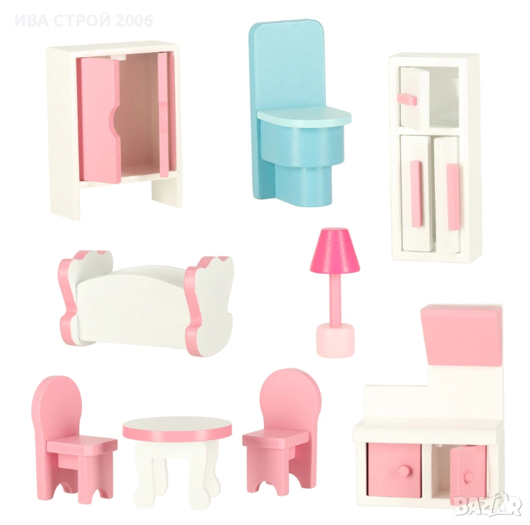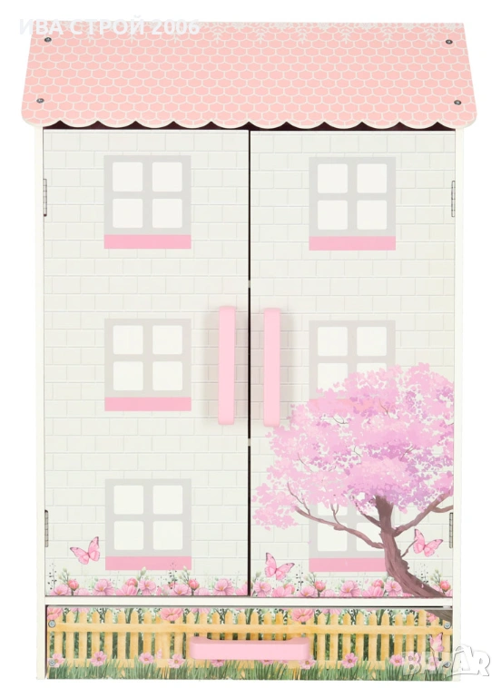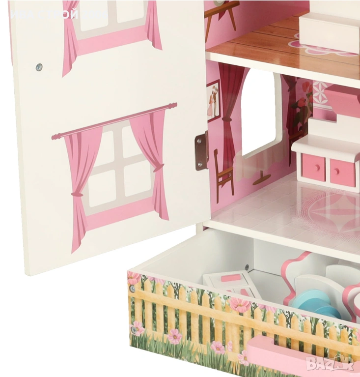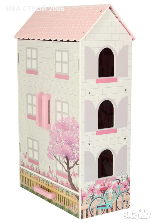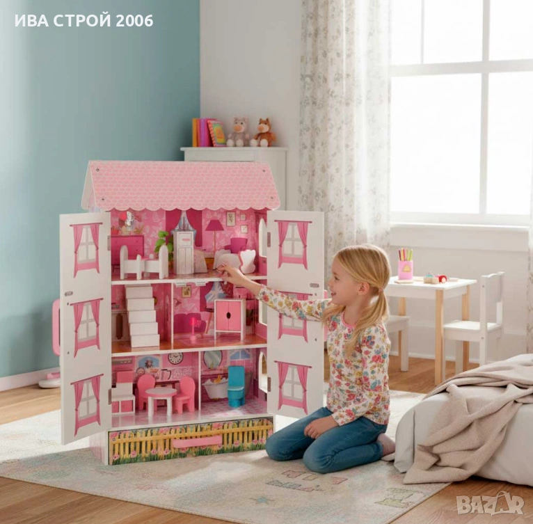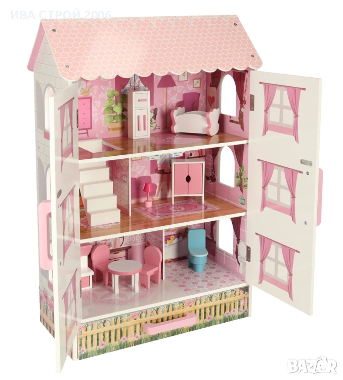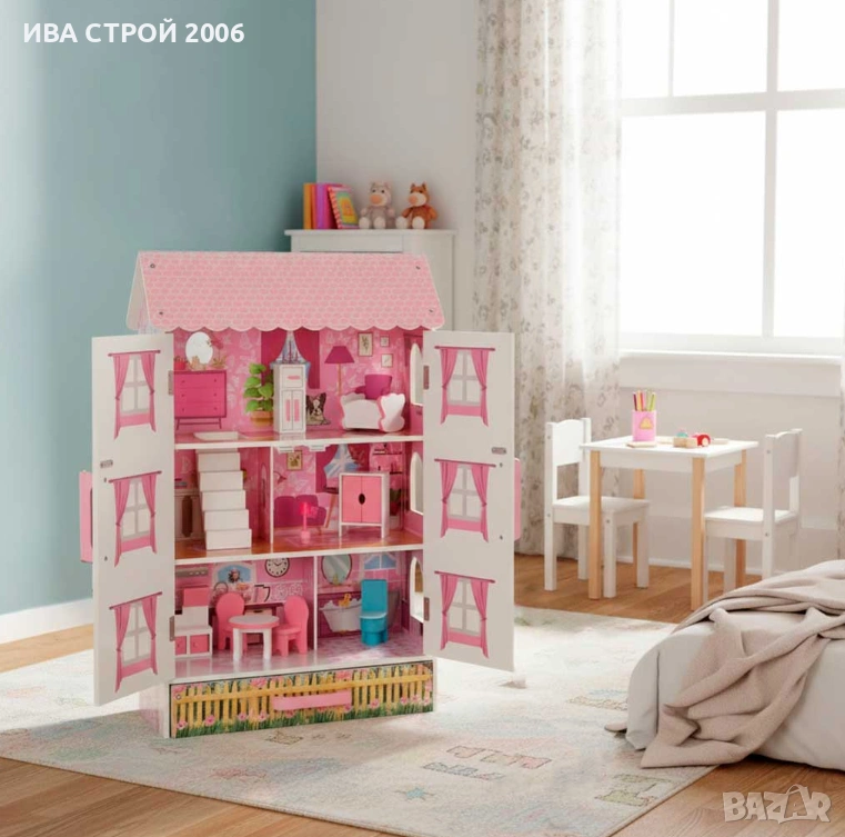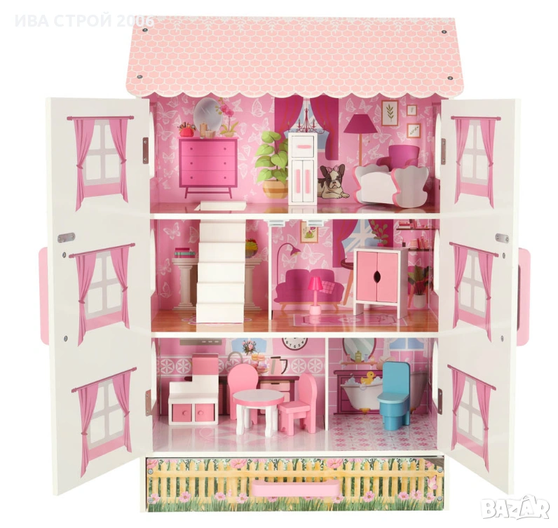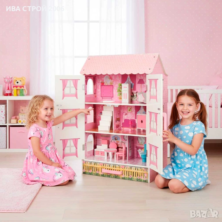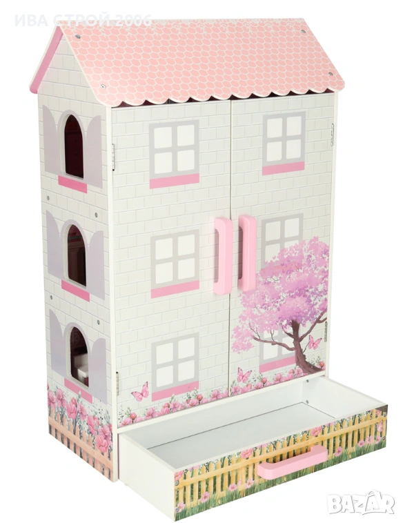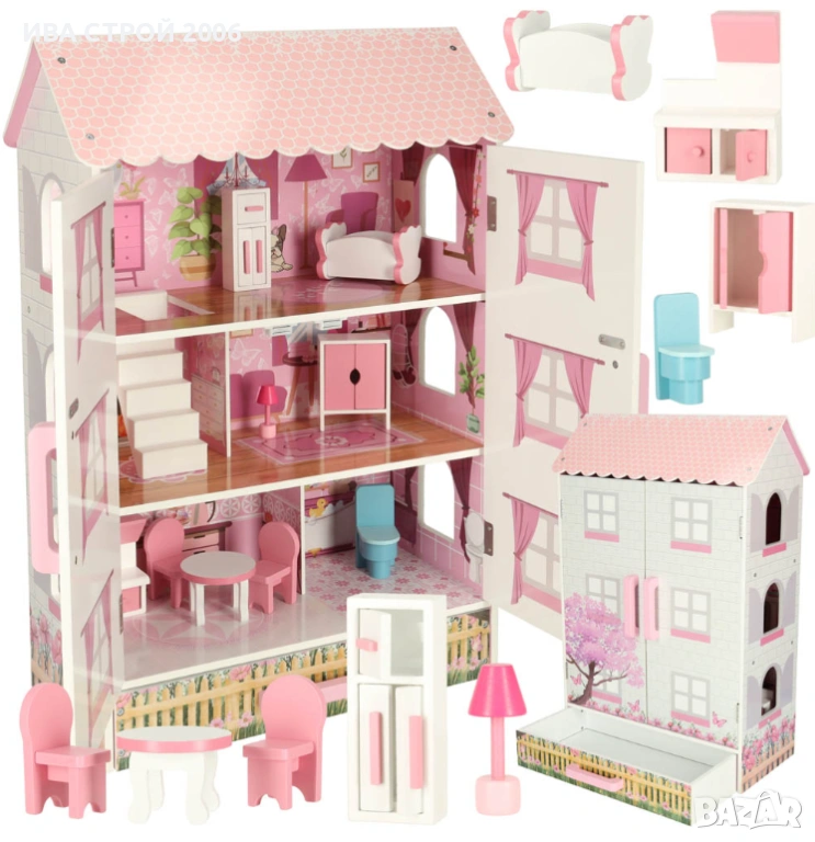 Триетажна дървена къща за кукли с мебели – перфектна играчка за развитие на въображението и креативността. Стилен дизайн, реалистични детайли и удобно чекмедже за съхранение.