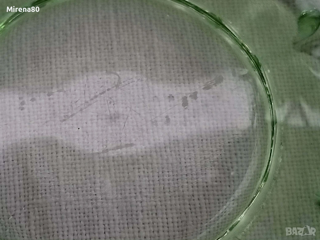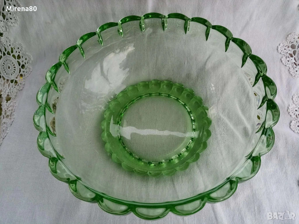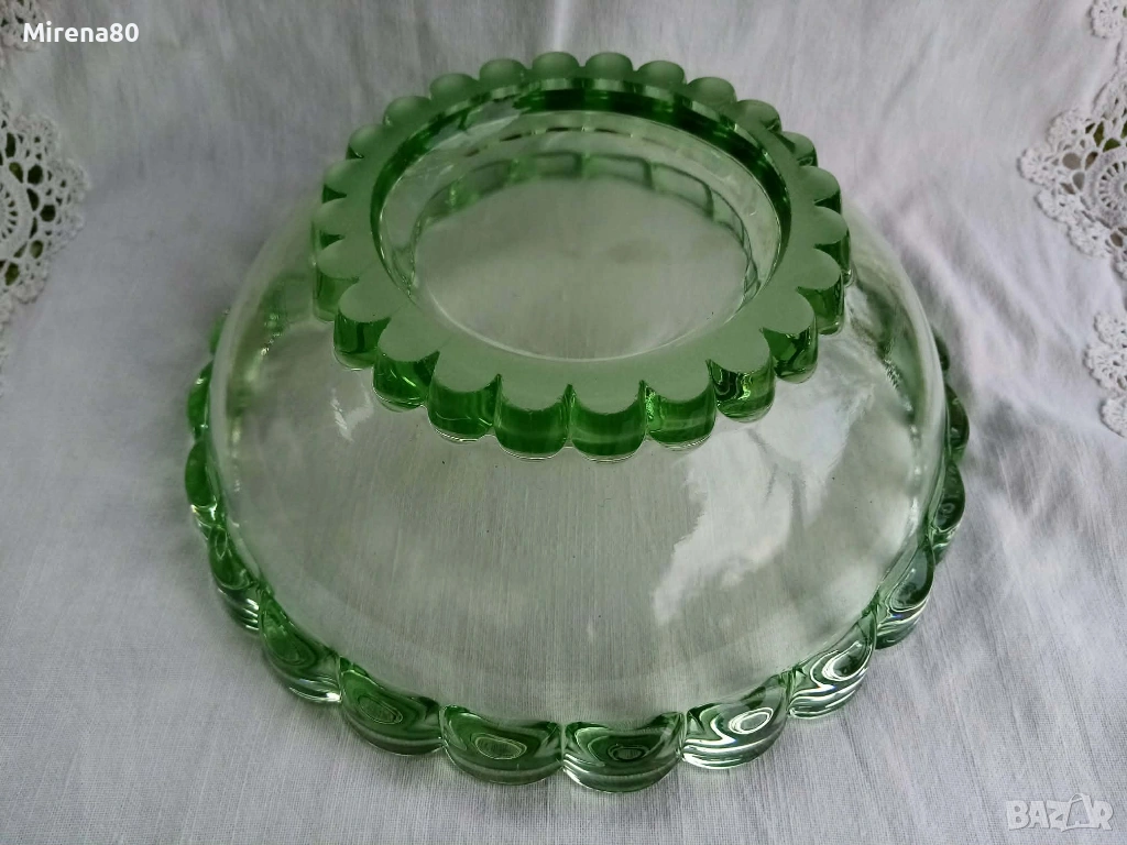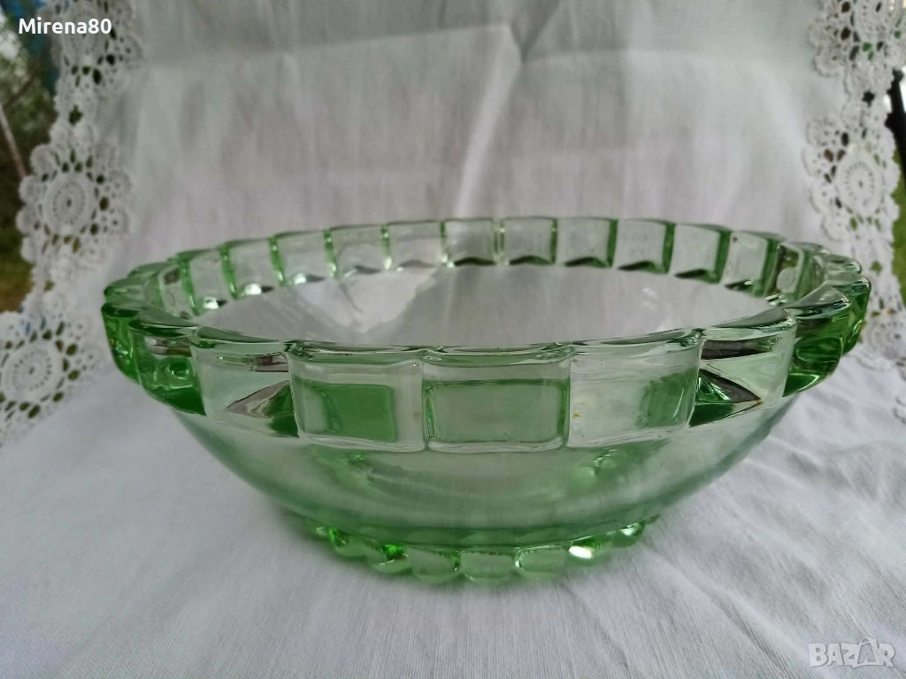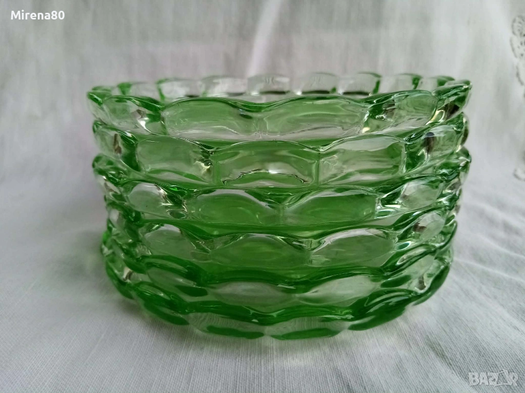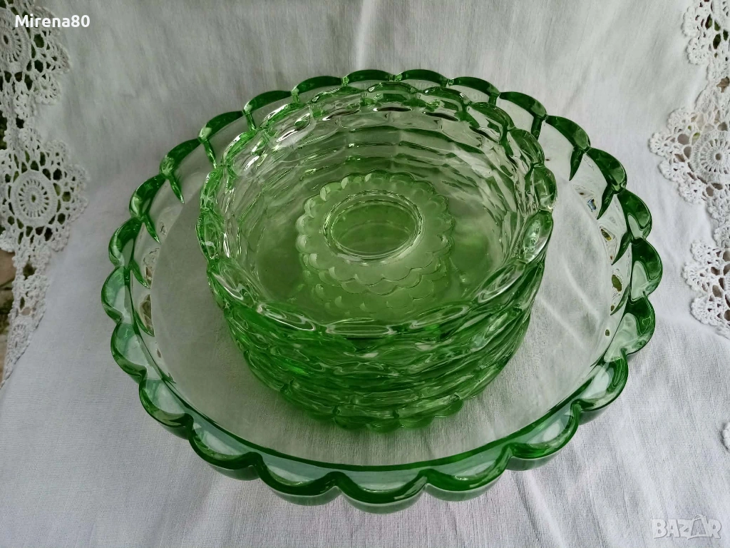 Ретро стъкло от миналия век в разкошен изумруденозелен цвят. Голяма купа (24/9 см) + 6 малки (15/3 см). На живо цветът е уникален ! Отлично състояние, единствено на една от малките чинийки има леко надраскване (посл. снимка).