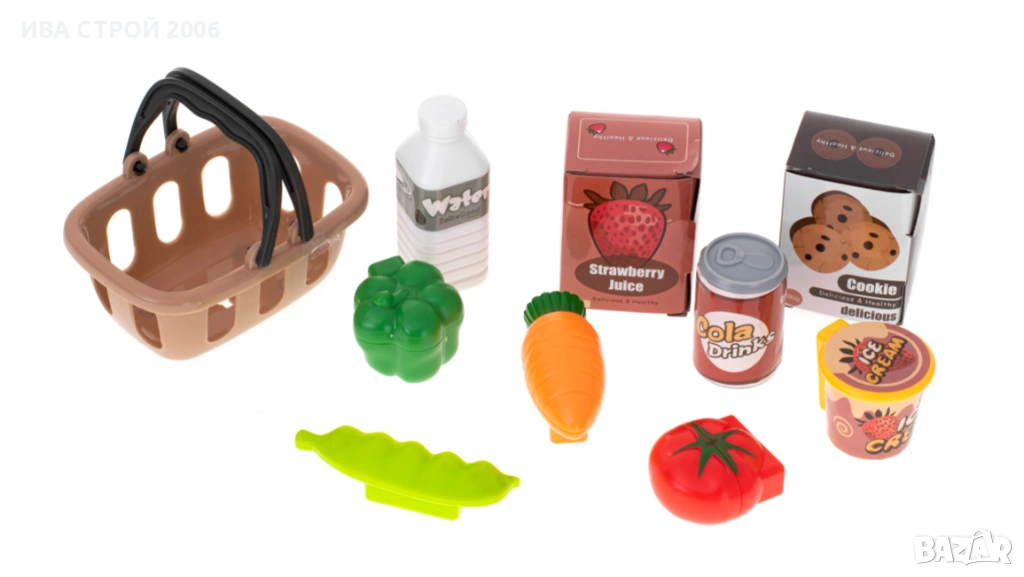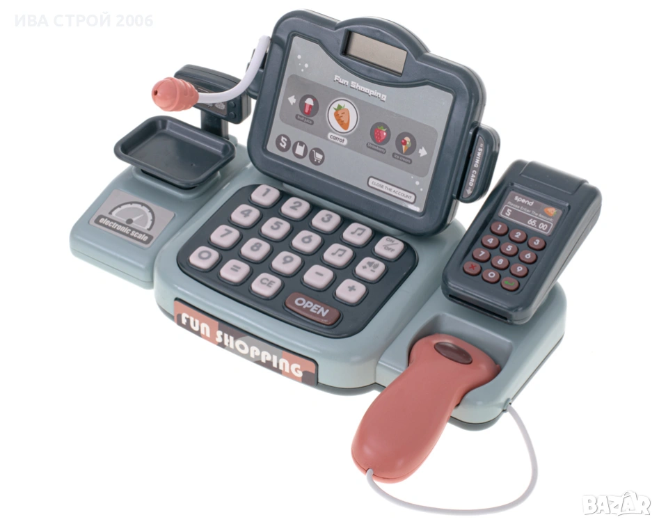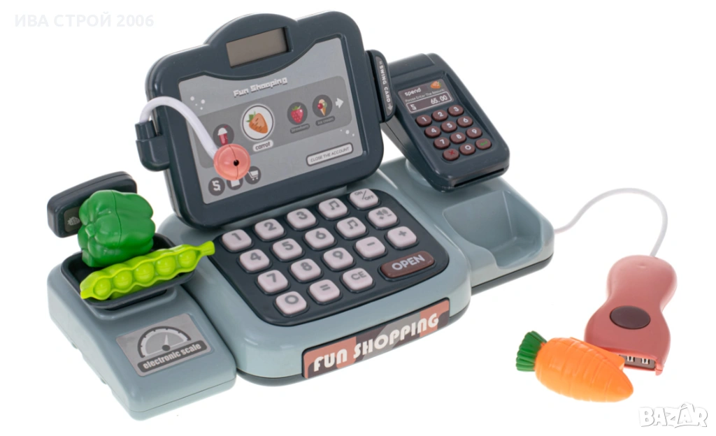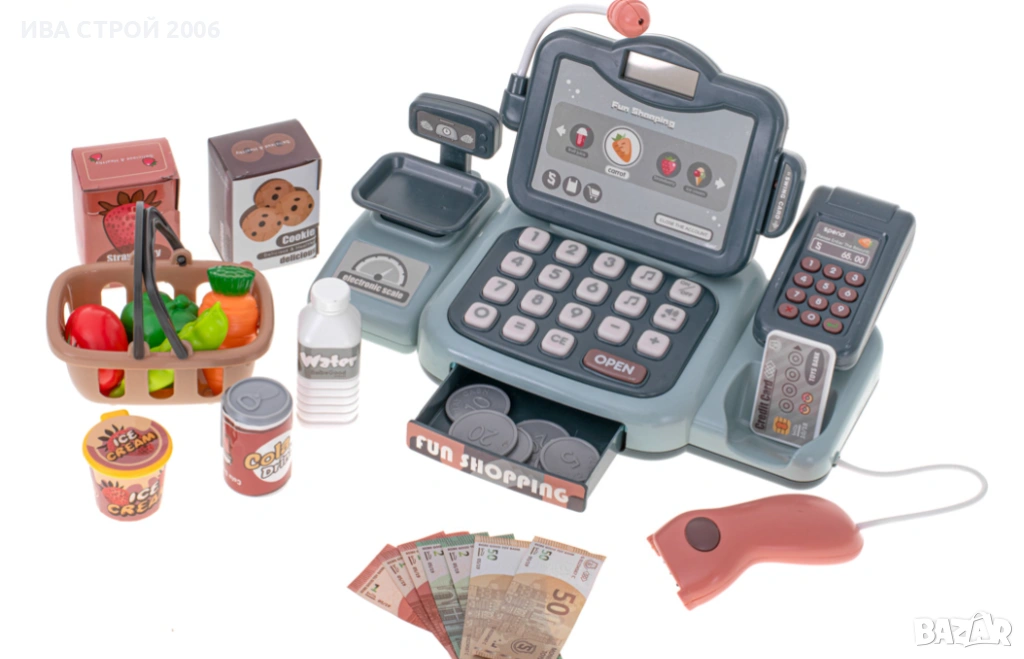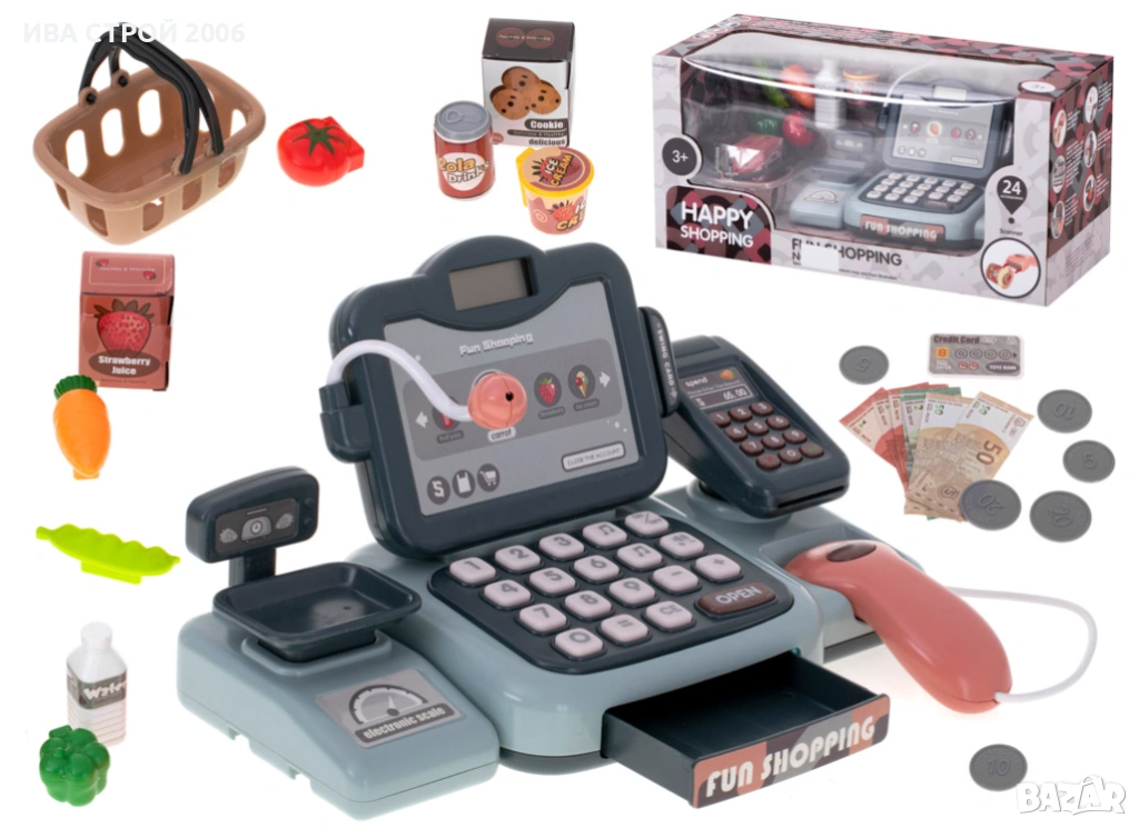 Детски комплект касов апарат с кошница и аксесоари – перфектна играчка за ролеви игри. С реалистични звуци, калкулатор и множество продукти за игра.
