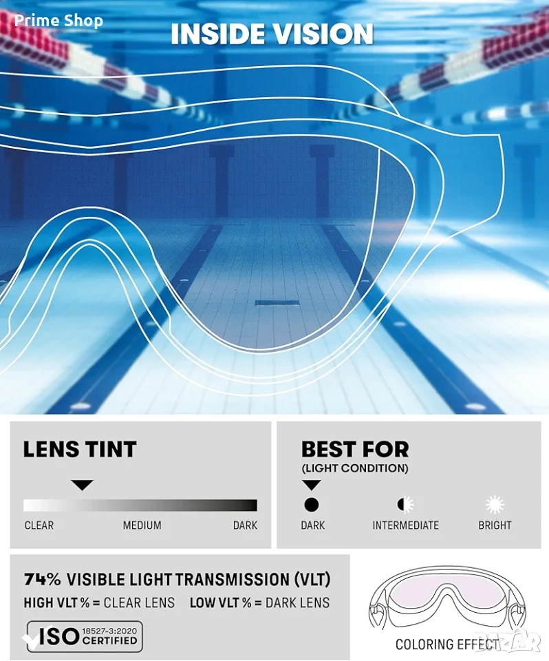 * Светъл тониран визьор, подходящ за закрити плувни басейни и условия на намалена светлина