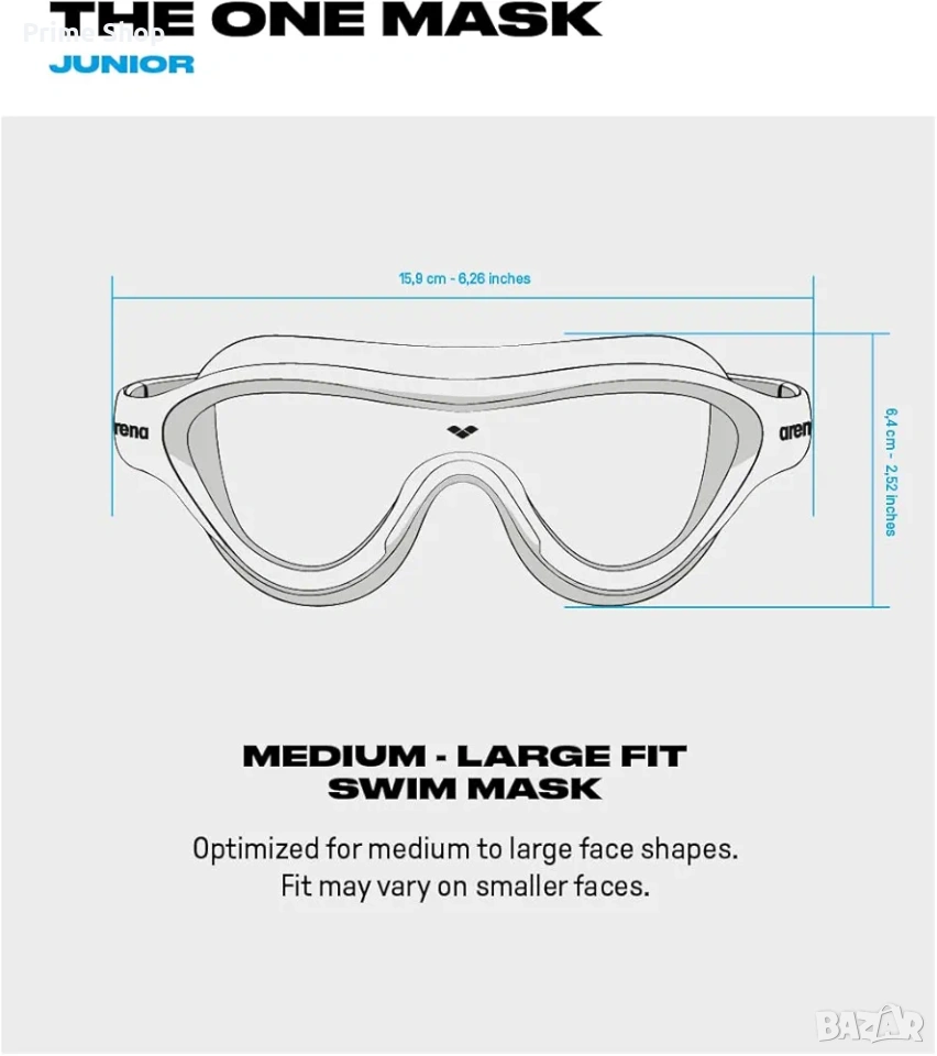 Маската за плуване ARENA The One Mask Jr е специализиран продукт, проектиран за млади плувци на възраст от 6 до 12 години. Моделът се отличава с минималистичен, но широк дизайн, предоставящ панорамно зрително поле без изкривяване. Използваната Orbit-Proof технология на уплътненията осигурява висока водонепропускливост и адаптивност към различни форми на лицето. Лещите са със 74% коефициент на пропускане на видимата светлина (VLT) и притежават ISO сертификат, което ги прави оптимално решение за закрити басейни и среда със средна до ниска осветеност.