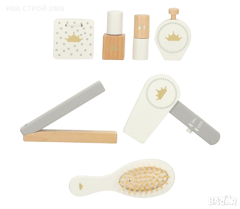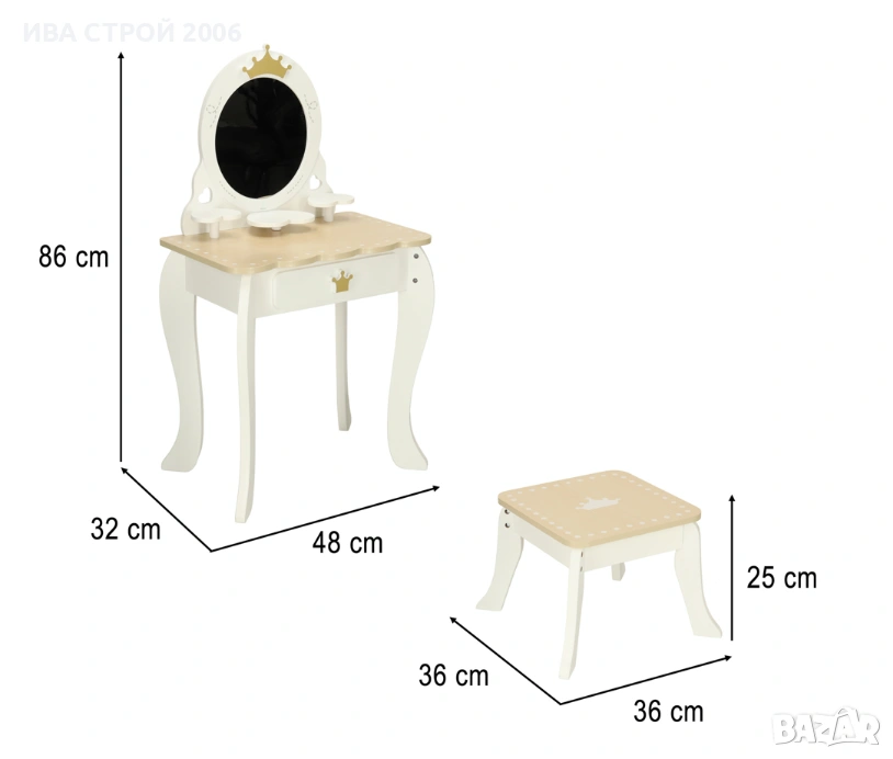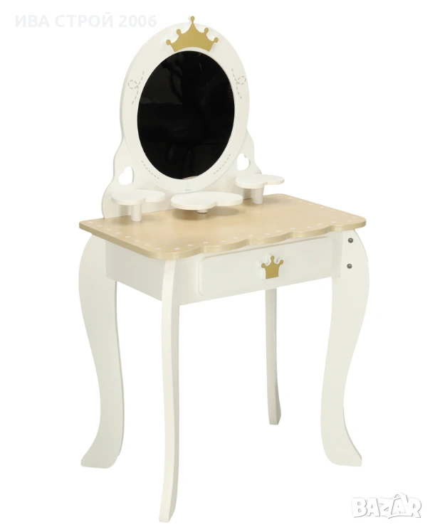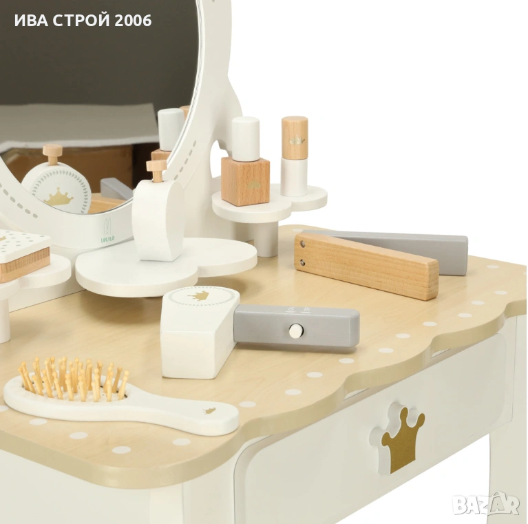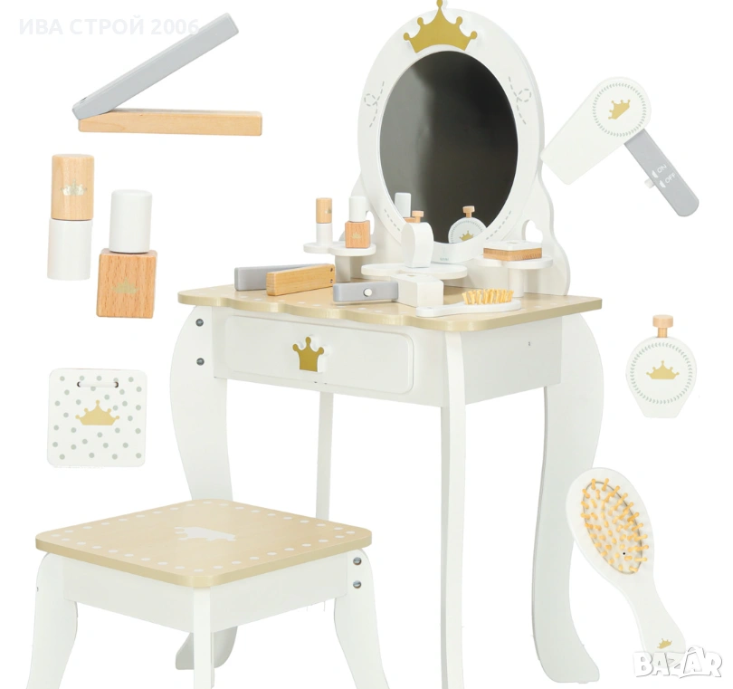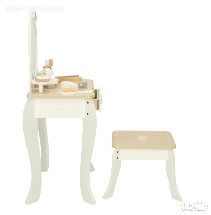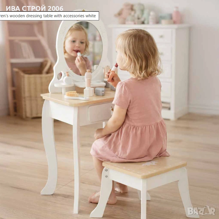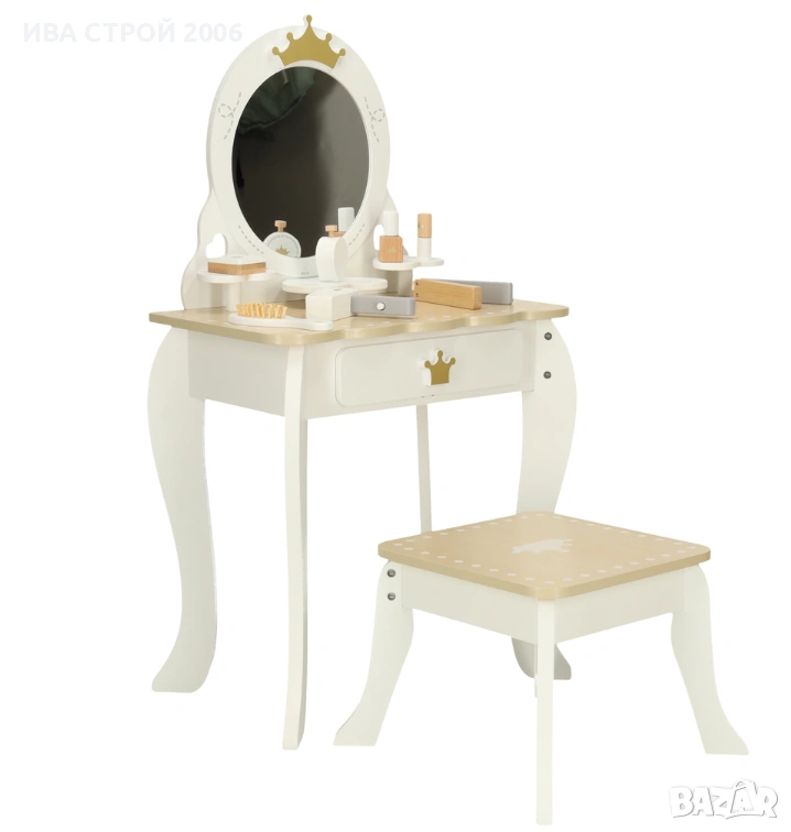 Елегантна детска дървена тоалетка с огледало, табуретка и аксесоари – перфектна играчка за малки принцеси. Реалистичен дизайн, удобство и забавление в едно.