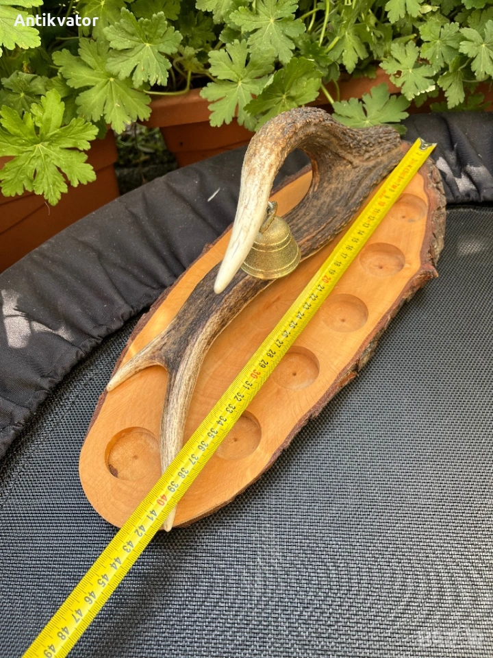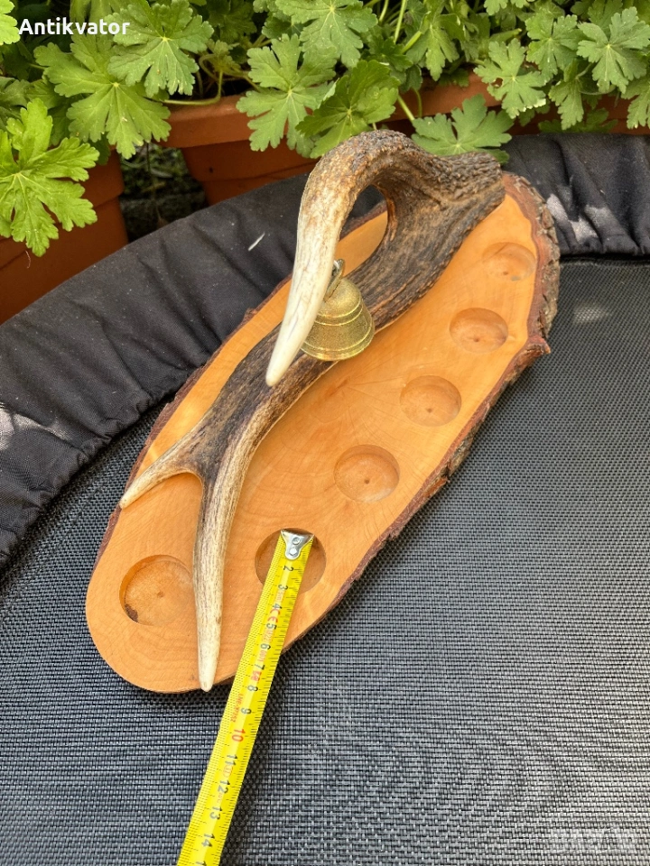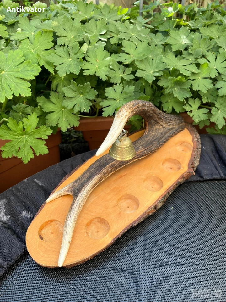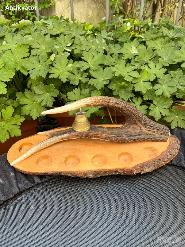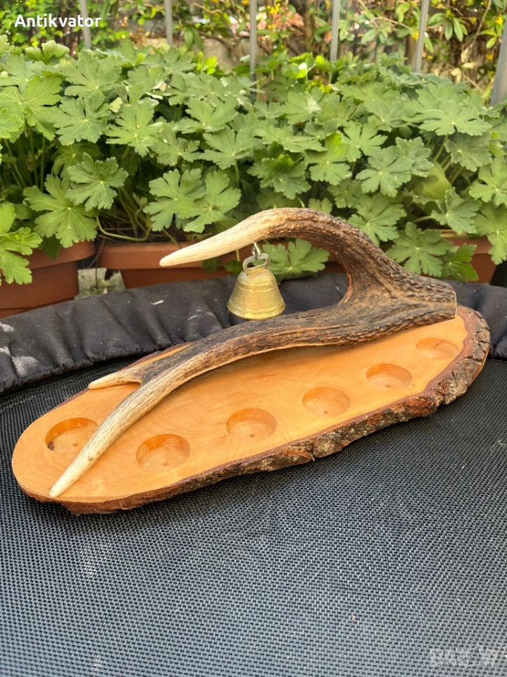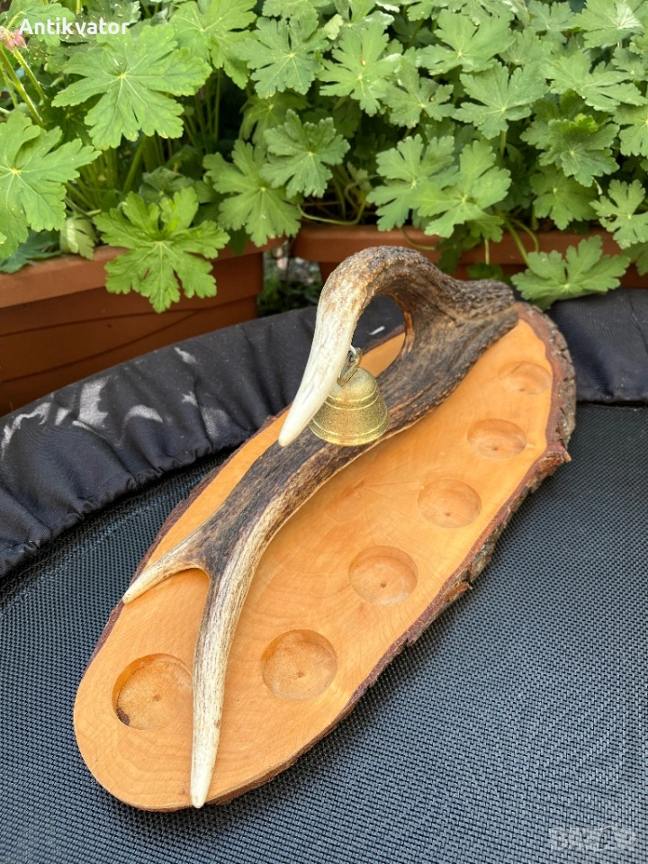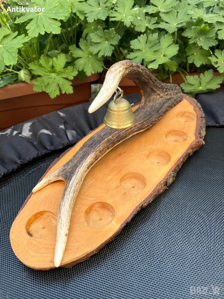 Красив дървен поднос с еленов рог и звънец.