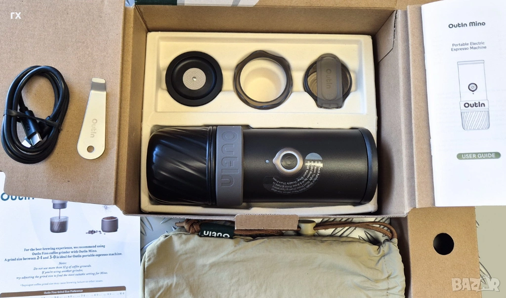 Новия модел преносима Еспресо Машина Outin Mino нова електрическа еспресо машина Outin Mino. Идеалното решение за любителите на качественото кафе по време на път, къмпинг, в офиса или сред природата. Машината работи както с мляно кафе, така и с капсули (съвместима с Nespresso).