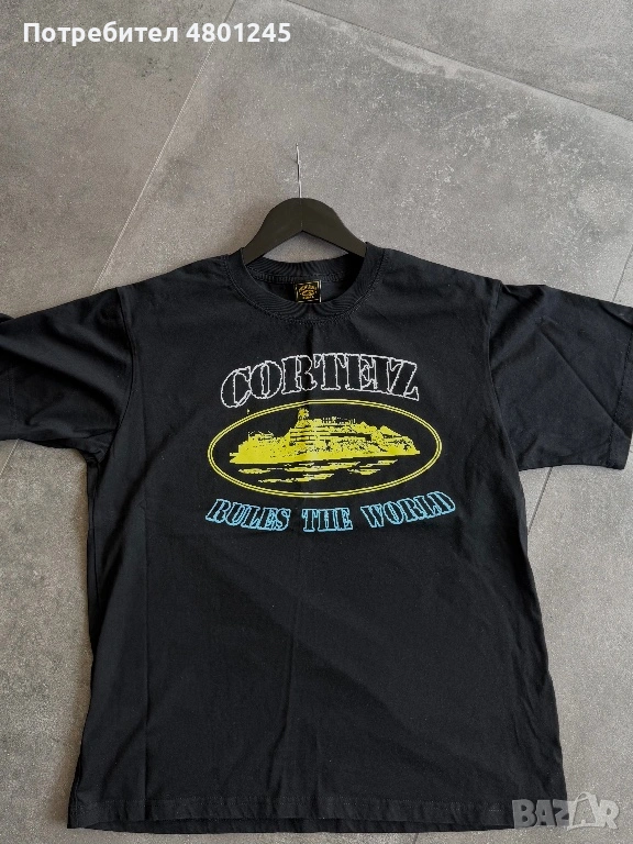 Продавам черна памучна тениска на популярния бранд Corteiz (RTW). Моделът е с емблематичния за марката графичен принт "Alcatraz" в жълто и надпис "Rules The World" в синьо. Тениската е със свободна кройка и е изключително актуална за почитателите на стрийтуер (streetwear) модата.
