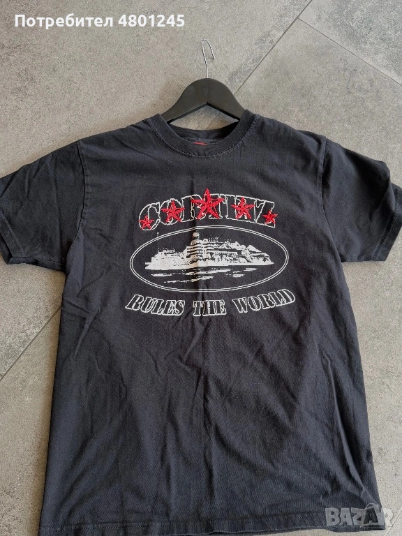 Продавам черна памучна тениска на бранда Corteiz (RTW). Дизайнът включва характерния за марката принт с острова Алкатраз, надпис "Rules The World" и акцент от червени звезди върху основното лого. Тениската е в популярен стрийтуер стил, със свободна и удобна кройка.