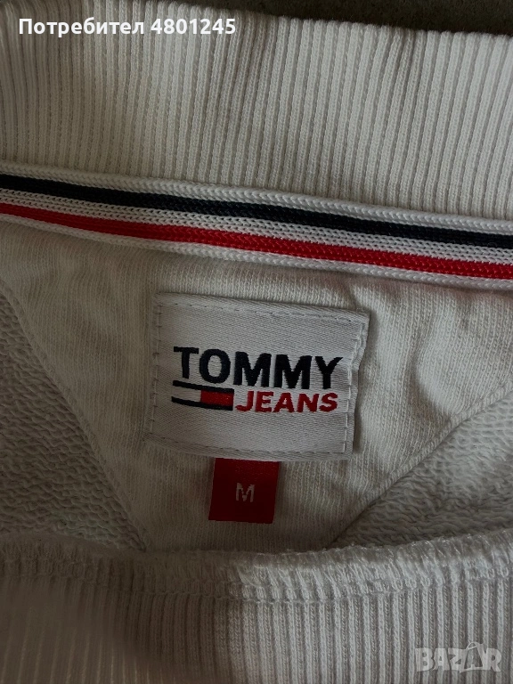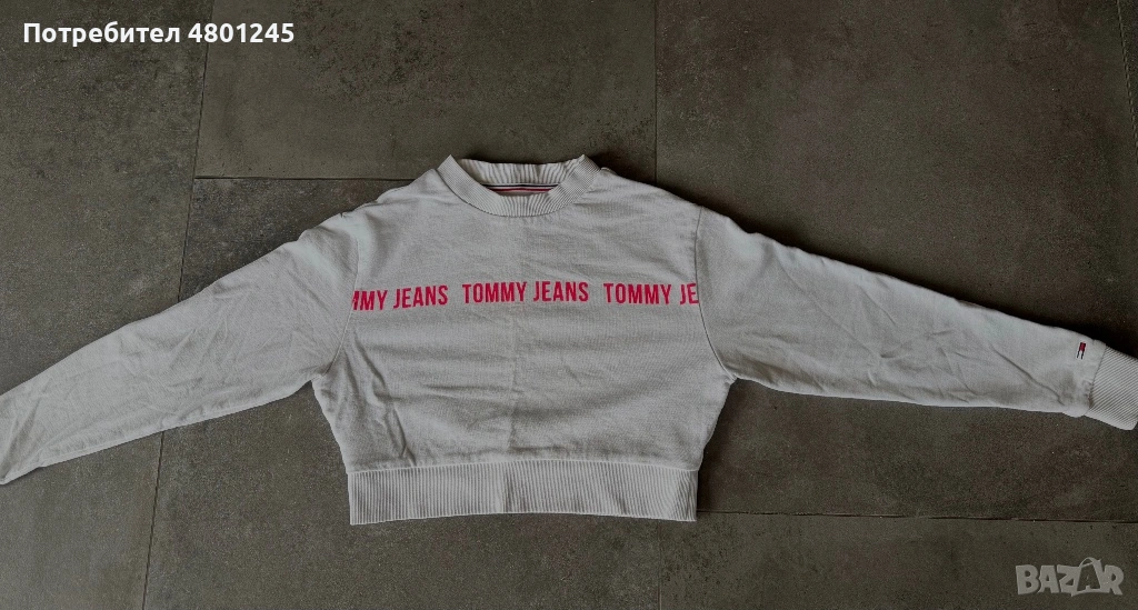Продавам страхотен дамски суитшърт на Tommy Jeans в бял цвят. Моделът е тип "crop" (къс силует) с ефектен червен надпис на марката през гърдите. Изработен е от плътна и качествена памучна материя, типична за бранда. На ръкава има дискретно бродирано лого (флагчето на Tommy).