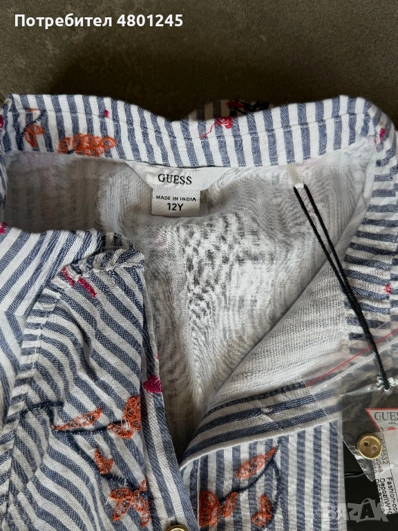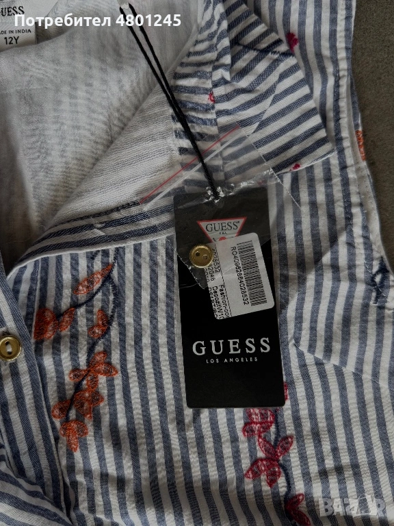 Продавам страхотна риза без ръкав на марката GUESS. Моделът е изключително нежен и ефектен, с десен на синьо-бели райета и красиви бродерии на цветя в оранжево и розово. Ризата има стилна предна част с волани (ruffles) и се закопчава с нежни седефени копчета със златист кант.