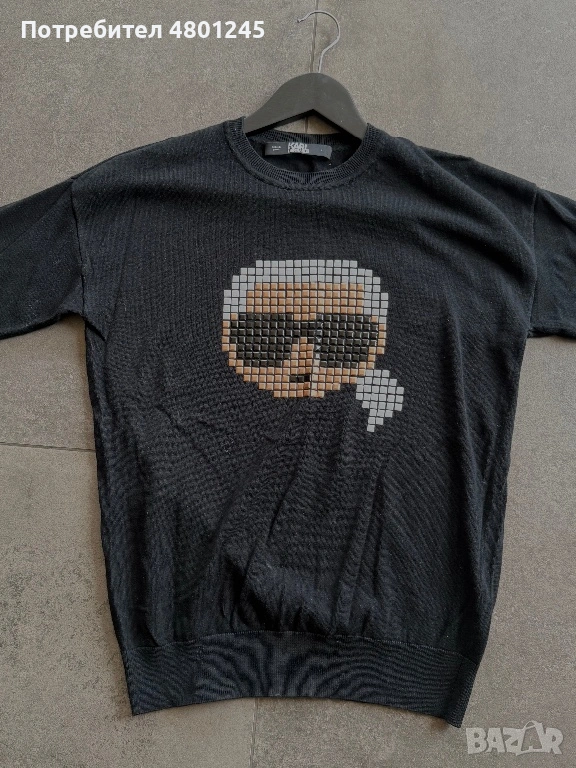 Продавам стилна мъжка/унисекс черна блуза от фино плетиво на марката Karl Lagerfeld. Отличава се с емблематичния за бранда пикселизиран принт на Карл Лагерфелд в предната част, изпълнен с релефни детайли. Изключително качествена изработка, подходяща както за ежедневна визия, така и за по-елегантен стил.