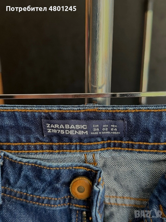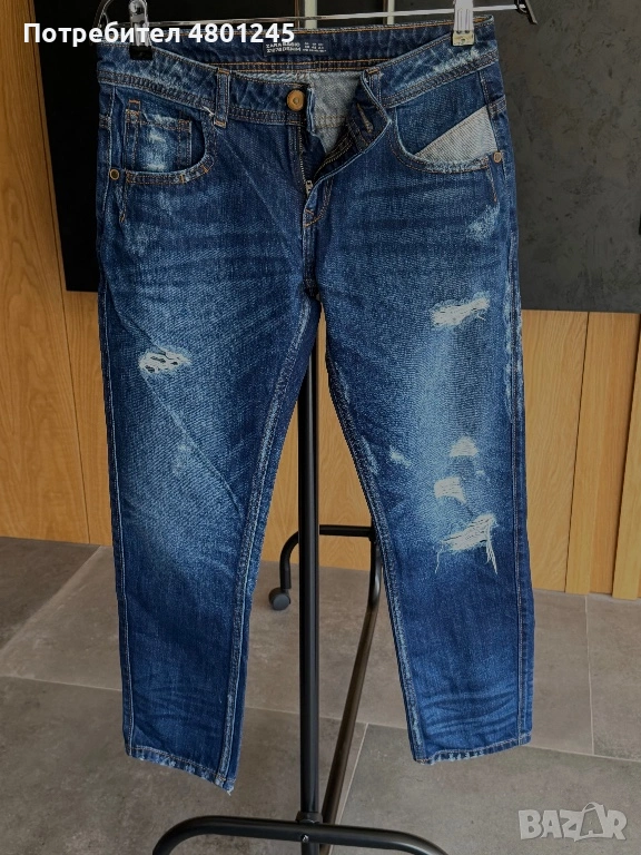 Продавам модерни дамски дънки на марката ZARA. Моделът е в класически деним цвят с ефектни изсветлени зони и актуални "накъсани" детайли (distressed look). Кройката е стилна и удобна, подходяща за ежедневна визия. Материята е качествена и здрава, характерна за деним линията на бранда.