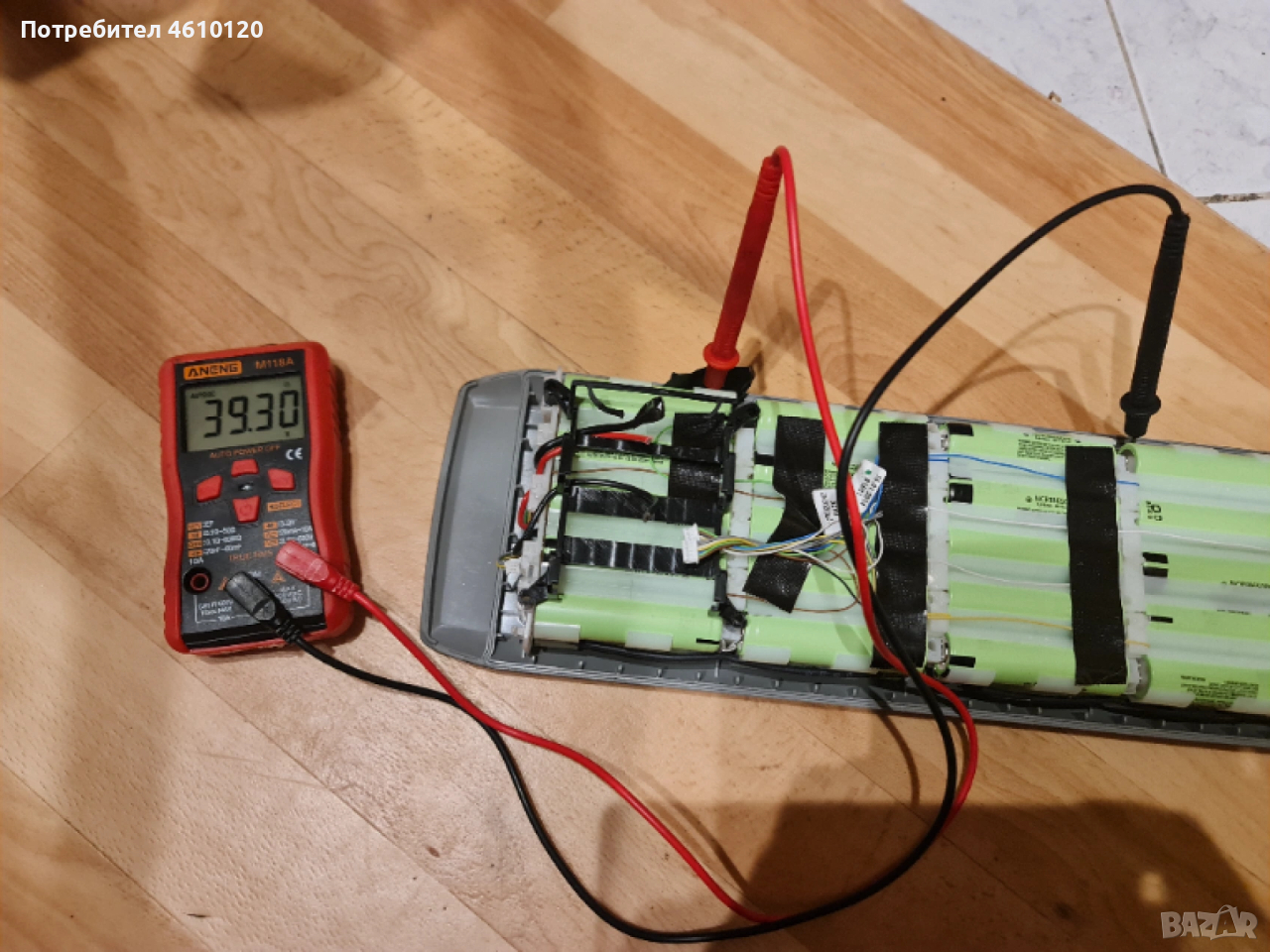 Продава се батериен пакет+кутията, без BMS, който беше повреден. Видно от снимките, пакета в моменна е на окала 39 волта. Продава се на цената на елементите - клетките са Panasonic.