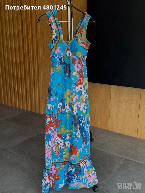 Продавам изключително красива дълга рокля (макси модел) на италианския бранд Imperial. Роклята е с наситен син основен цвят и ефектен многоцветен флорален принт. Моделът е с V-образно деколте, къдрици на презрамките и ластик в областта на талията, който осигурява комфорт и перфектно прилягане. Долната част завършва с красив волан, който придава обем и движение.