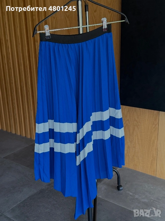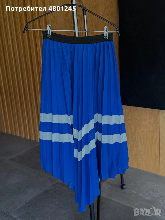 Продавам атрактивна плисирана пола на марката Zara Basic. Полата е в наситен кралско син цвят с контрастни бели хоризонтални линии, които й придават динамичен и модерен вид. Моделът е с черен еластичен колан на талията за максимален комфорт и интересен асиметричен подгъв, който пада красиво при движение. Подходяща както за ежедневна визия с кецове, така и за по-елегантен повод.