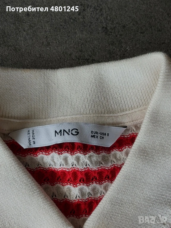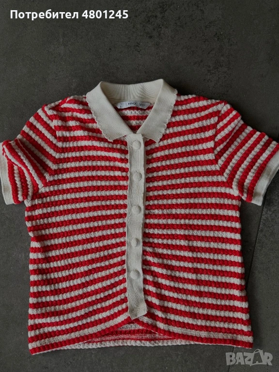 Продавам ефектна къса блуза (кардиган) с къс ръкав на марката Mango (MNG). Моделът е изработен от релефна, ефектна плетка на червени и бели райета. Отличава се с нежна якичка с вълнообразен детайл по ръба и красиви облечени копчета отпред. Материята е мека и еластична, много приятна за носене.