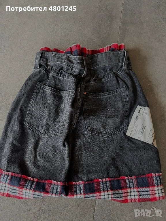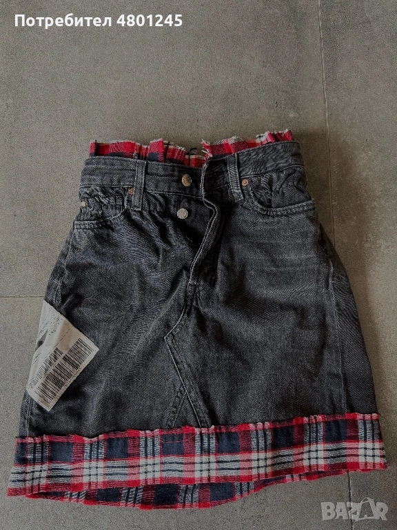 Продавам нестандартна къса пола, изработена от качествен деним в цвят графит. Моделът е с изключително модерен "разчупен" дизайн – включва вградени детайли от червено каре на талията и подгъва, както и оригинални нашивки (пачове), имитиращи транспортни етикети. Полата е с висока талия тип "paperbag" и леко разрошени краища за по-бунтарско излъчване.