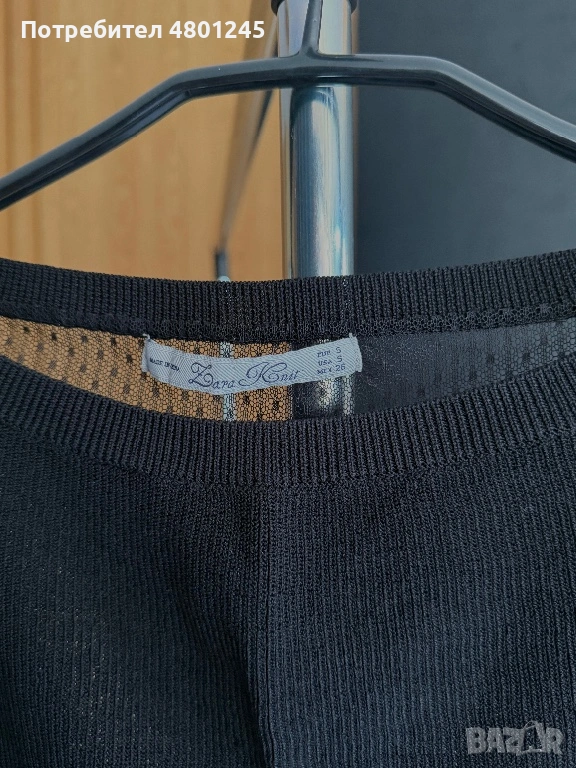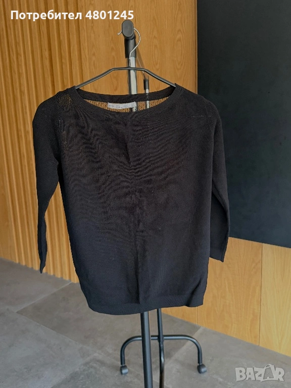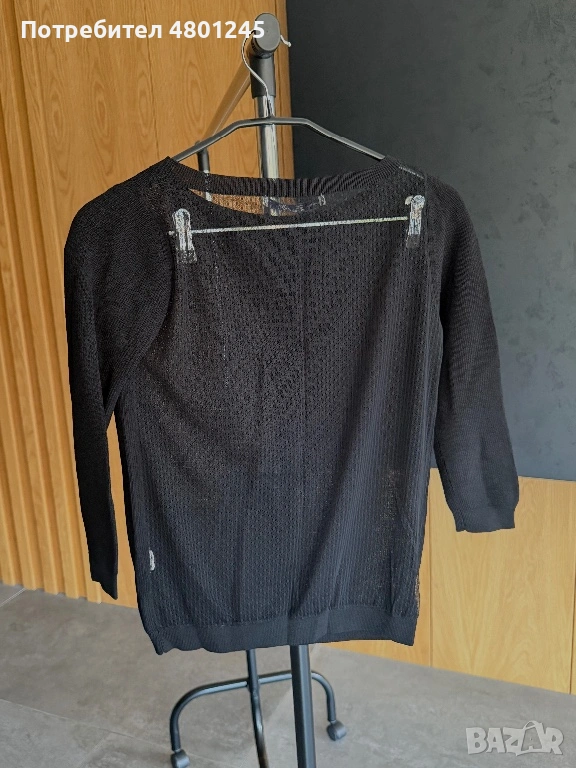 Продавам стилна черна блуза на марката Zara Knit. Моделът е с изчистен дизайн отпред, 3/4 ръкави и лодка деколте. Истинският акцент е на гърба, който е изработен от фина, полупрозрачна материя на деликатни точки (тип тюл/дантела), което придава изтънченост и женственост. Плетката е фина и лека, идеална за преходните сезони или официален повод.