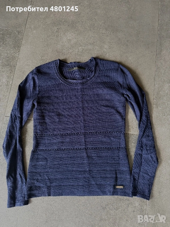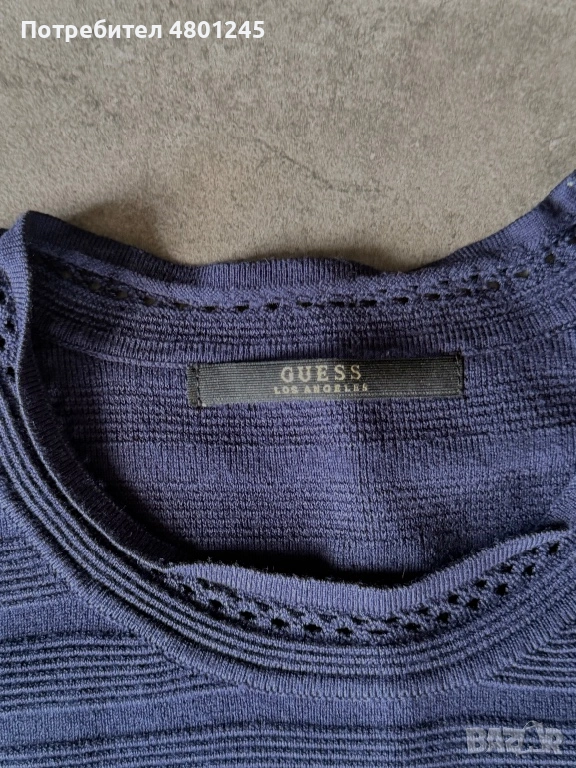 Продавам оригинална дамска блуза с дълъг ръкав на марката Guess Los Angeles. Блузата е в красив тъмносин цвят (royal blue/navy), изработена от изключително фино и качествено плетиво. Дизайнът се отличава с хоризонтална релефна текстура и деликатни ажурни елементи (тип дантела) около деколтето и в долната част. В долния край има дискретно метално лого на марката.