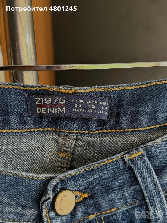 Продавам дамски дънки от серията Z1975 Denim на ZARA. Моделът е в класически син цвят с фабрично изсветлени участъци и ефектни накъсвания (distressed look), които му придават модерна и небрежна визия. Изработени от качествен деним, дънките са със стандартно закопчаване с копче и цип и пет функционални джоба.