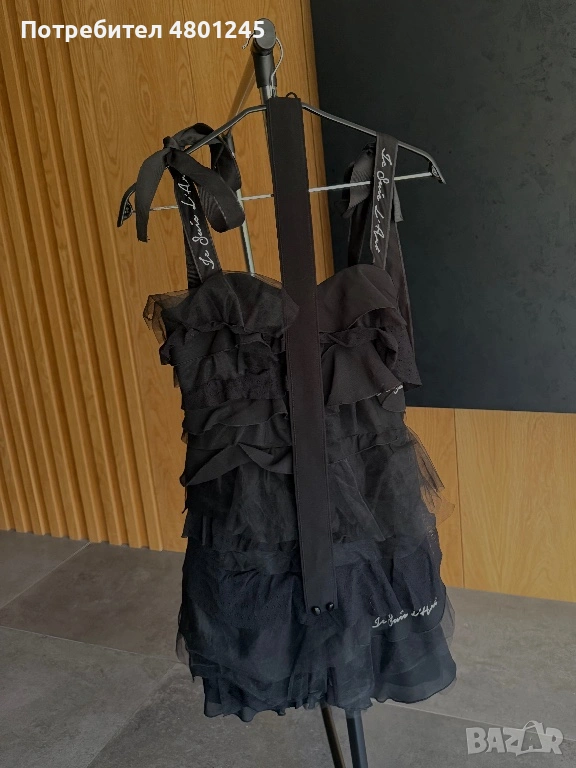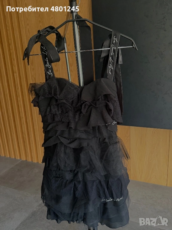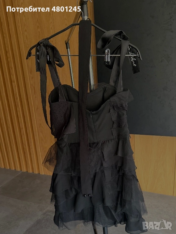 Продавам изключително атрактивна черна мини рокля на българския бранд AVIN boutique. Моделът е с богат дизайн на етажи от фин тюл и дантела, които създават обем и раздвижена визия. Презрамките са широки, тип панделки с нежен надпис, които позволяват регулиране. Роклята е с втален корсетен силует в горната част и скрит цип на гърба. Изключително подходяща за официални събития, партита или специални поводи.