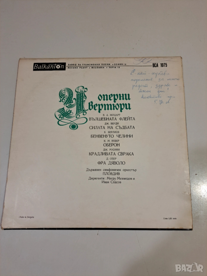 Продавам винил плоча с класическа музика – Оперни увертюри от Моцарт, Верди, Берлиоз, Росини и Обер, издание на Balkanton.
