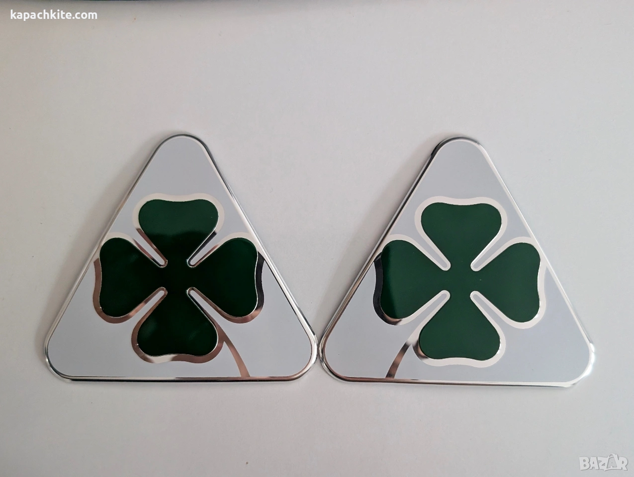 Алуминиеви емблеми за калниците Quadrifoglio Verde за Alfa Romeo Giulia Stelvio и други. Емблемите са с двойнозалепяща лента на гърба. Детелините са симетрични, съответно за ляв и десен калник за Алфа Ромео Джулия Стелвио Куадрифолио. Цената е за комплект 2 броя. За гр. Пловдив лично предаване, за страната с Еконт.