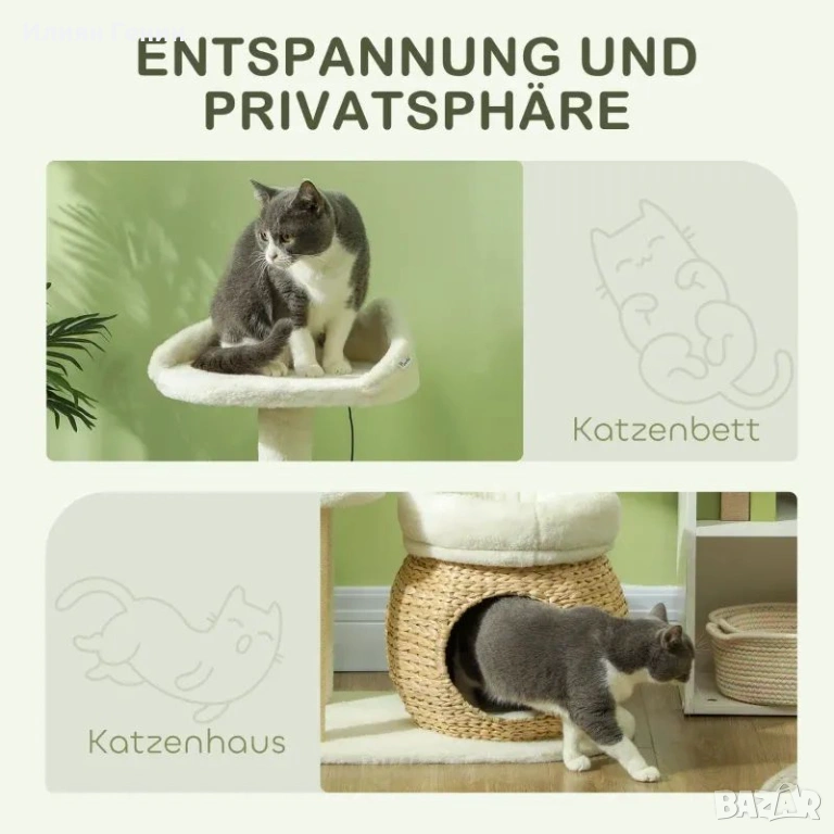 Естествено и уютно: Дървото за котки е изработено от естествена тръстика, а леглата и платформата са покрити с мек плюш. Това създава приветливо убежище, което предлага на вашия домашен любимец максимален комфорт.