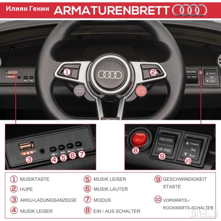Основни характеристики: Тази електрическа кола за деца възпроизвежда външния вид на истинско Audi, отговаряйки на високи стандарти. С предна и задна предавка, фарове, задни светлини, клаксон и табло, децата изпитват наистина автентично изживяване при шофиране. Музика може да се възпроизвежда и през USB порта на колата, което прави возенето по-приятно и реалистично за вашето дете.
