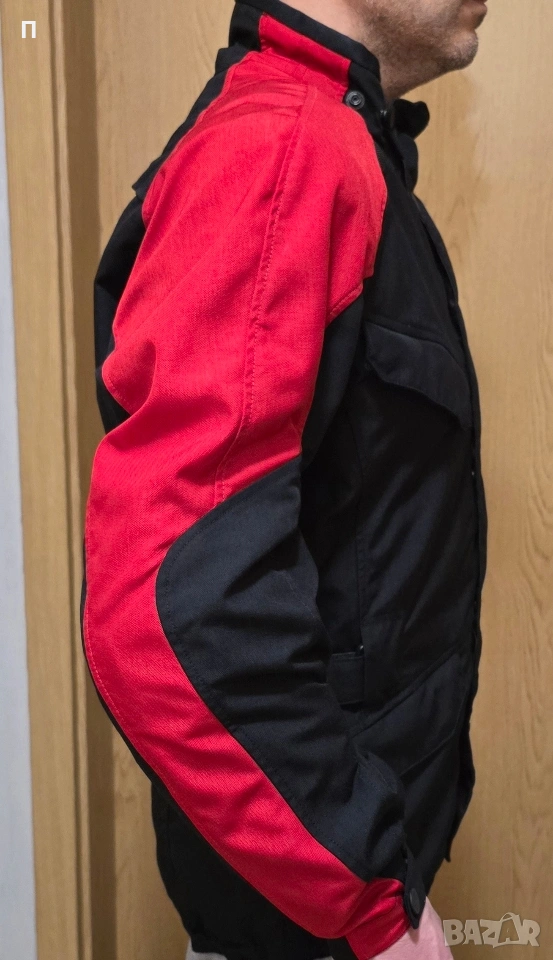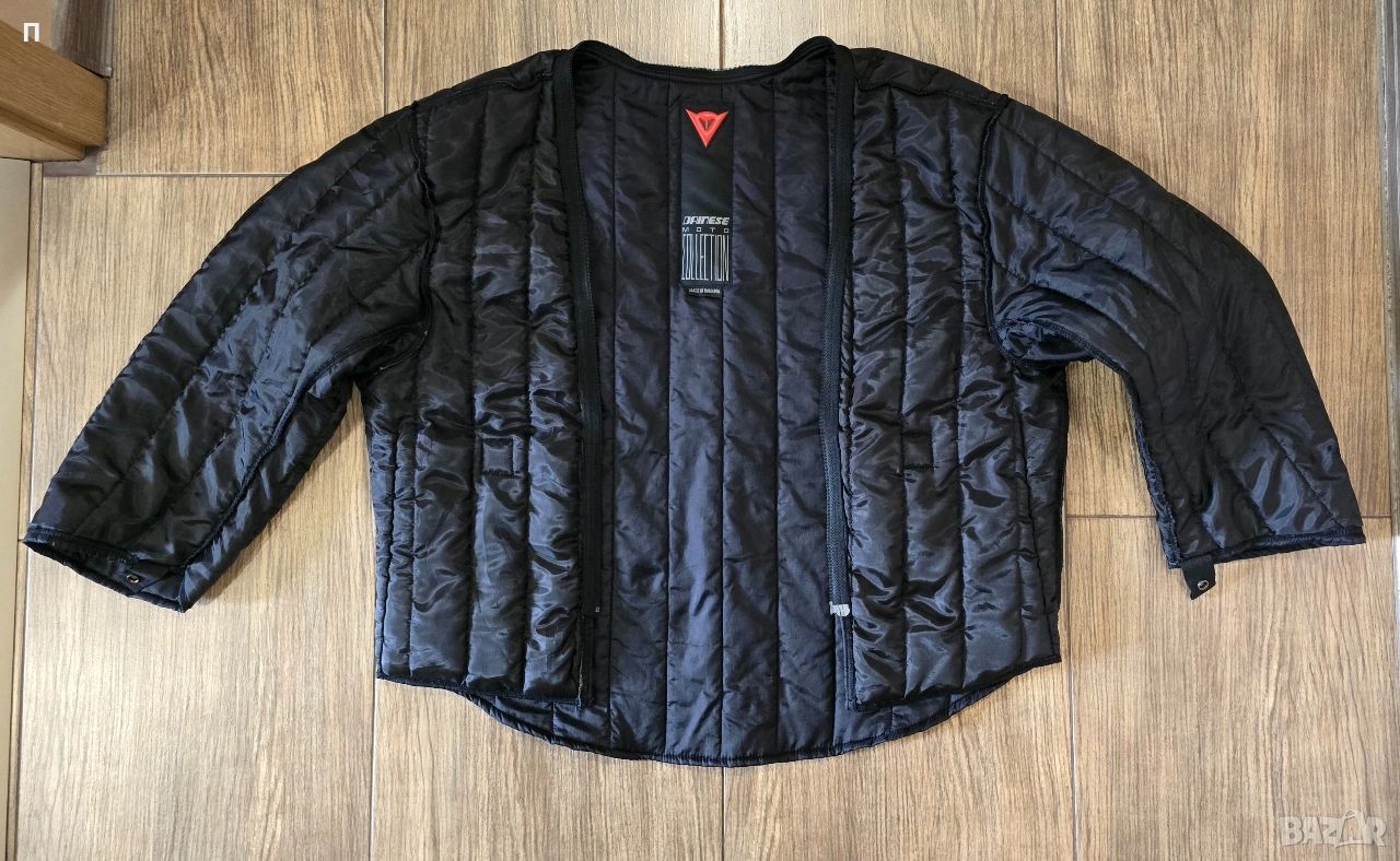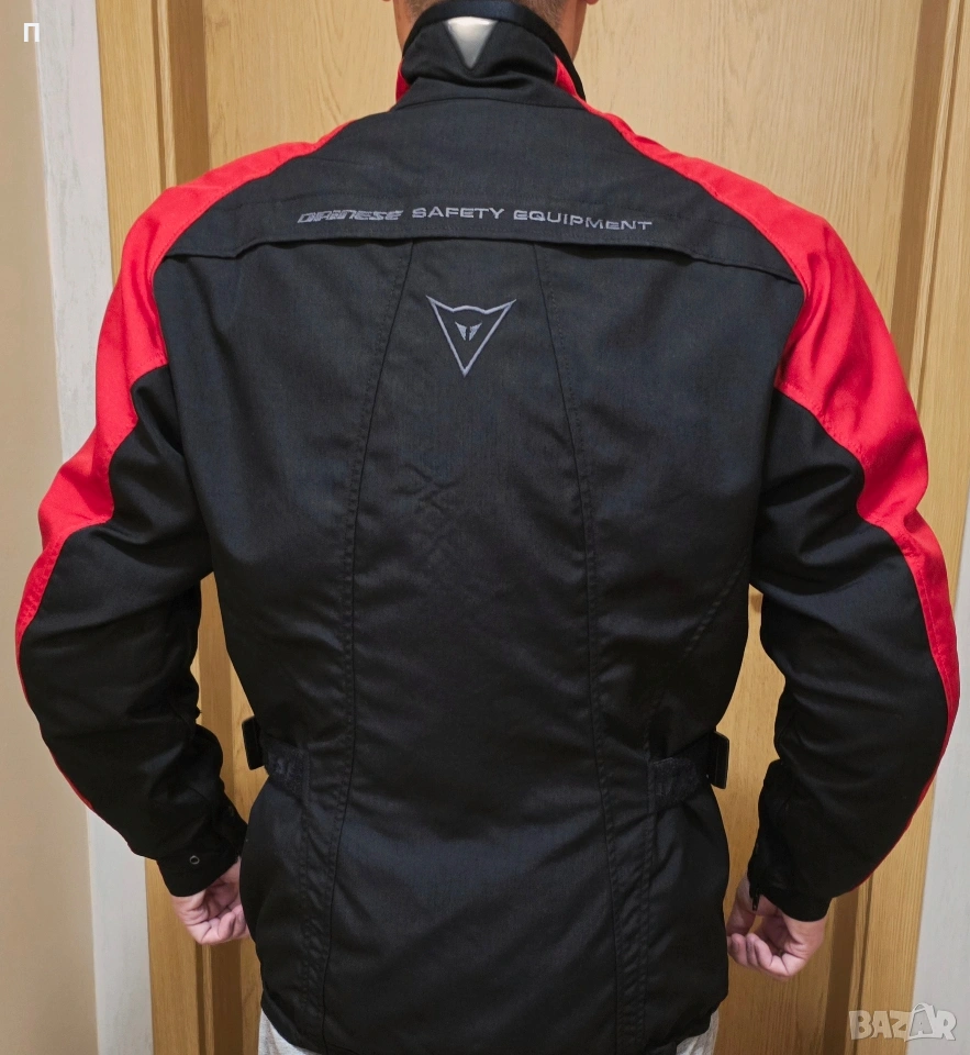 Туристическо мото яке Dainese. Водна бариера Goretex. Пълен набор протектори - гръб, рамене и лакти. Сваляема зимна подплата. Водо защитени джобове. Може да се регулира ширината в кръста и ширината на ръкавите. Всички копчета и ципове са изправни. Якето е изпрано и прибрано за новия собственик. Размера е 48 (S).
