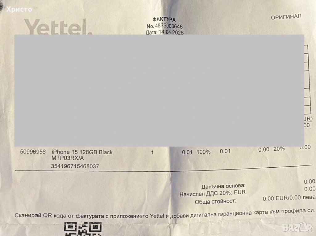 Продавам Apple iPhone 15 в чисто ново състояние – телефонът е неразпечатан и неактивиран. Закупен е на 14.04.2026 г. и разполага с 36 месеца гаранция. Устройството е напълно оригинално и работи с всички мобилни оператори. Към телефона получавате и подарък оригинален адаптер на Apple. Без бартери!!!