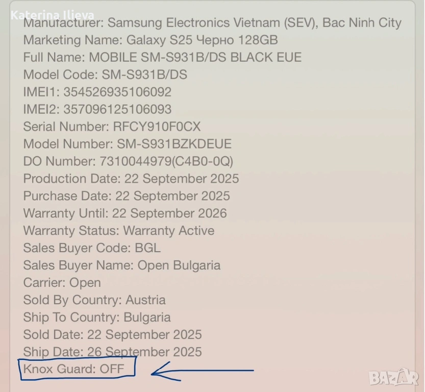Телефонът е чисто нов, запечатан. Имам касова бележка и документ за покупката, които ще предоставя, не е на изплащане, няма да се заключи. Прикачвам снимка на проверка на Knox Guard-a.